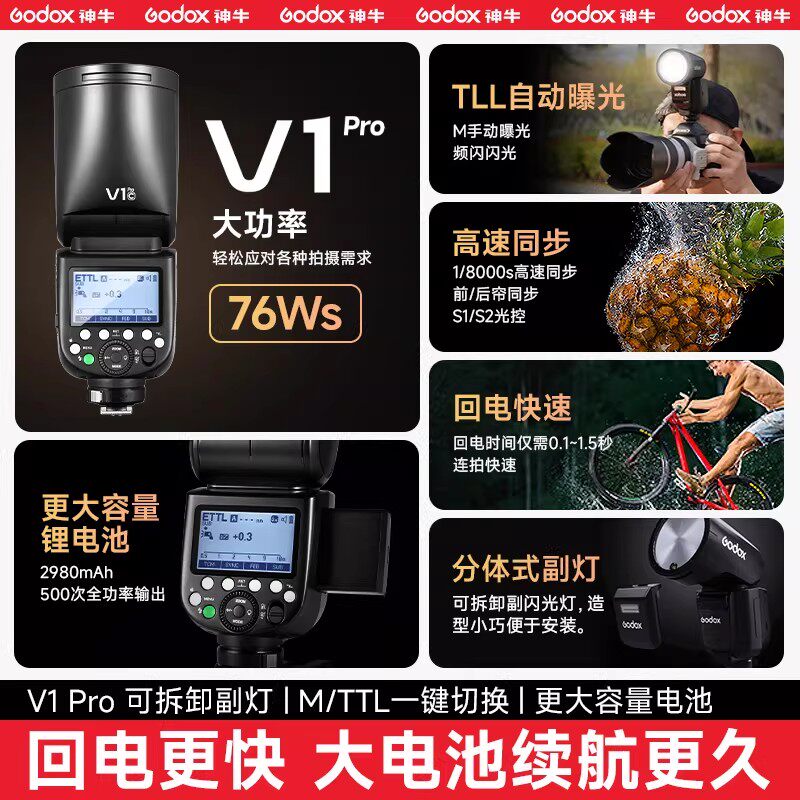 📚 Godox神牛V1 V100 V1Pro V1mid专业圆头闪光灯单反摄影机顶灯 适用佳能尼康索尼富士XT20微单相机外置补光灯