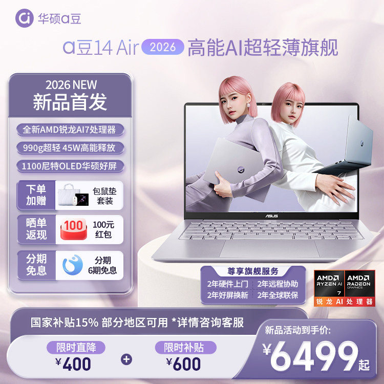27¥ CZ007 qSPCUkU4AaQ¥ https://m.tb.cn/h.7GpbKLt 【新品】华硕a豆14 Air 2026新品锐龙AI 7 H 445 14英寸高性能轻薄本笔记本电脑学生网课办公设计游戏本 --------------------- 【原售价】8,399元 【现售价】7,299元。