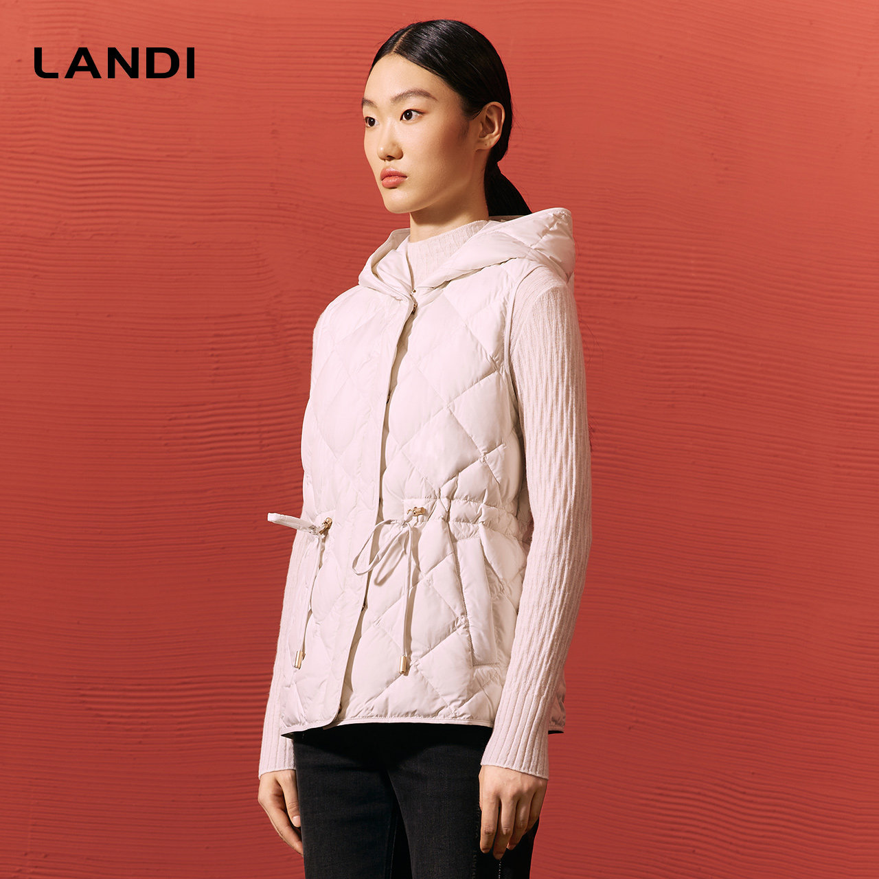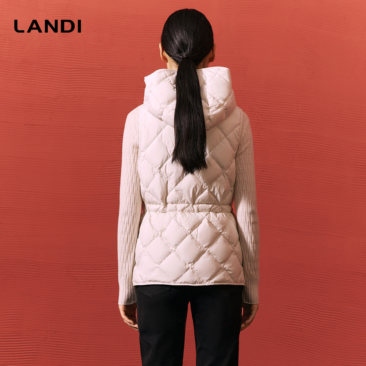 📚 LANDI米白色白鹅绒抽绳收腰连帽短款羽绒服马甲女上衣冬新品
