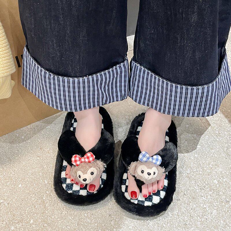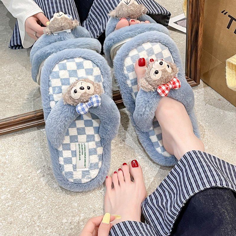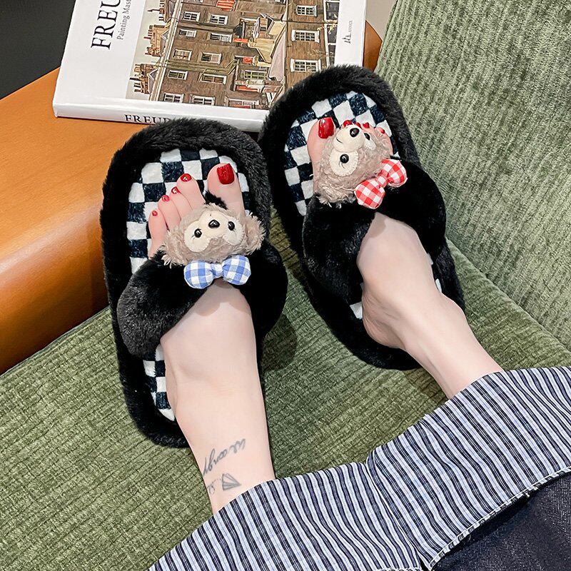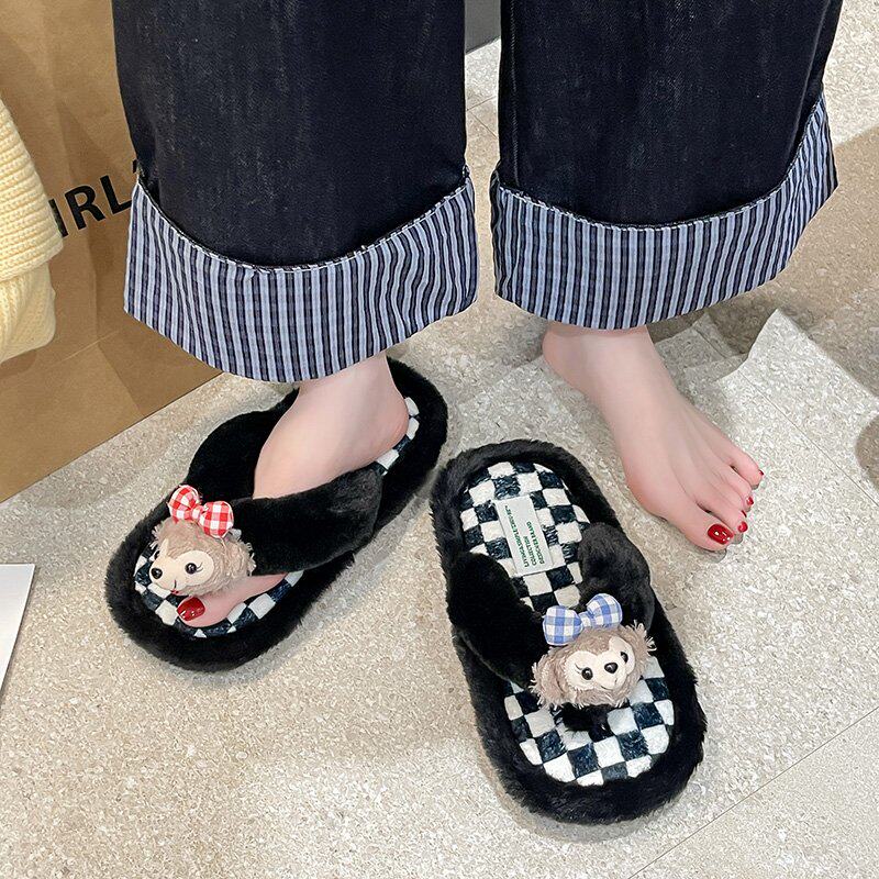 📚 高颜值可爱减龄雪莉玫夹板毛绒绒拖鞋女秋冬季居家软底舒适人字拖