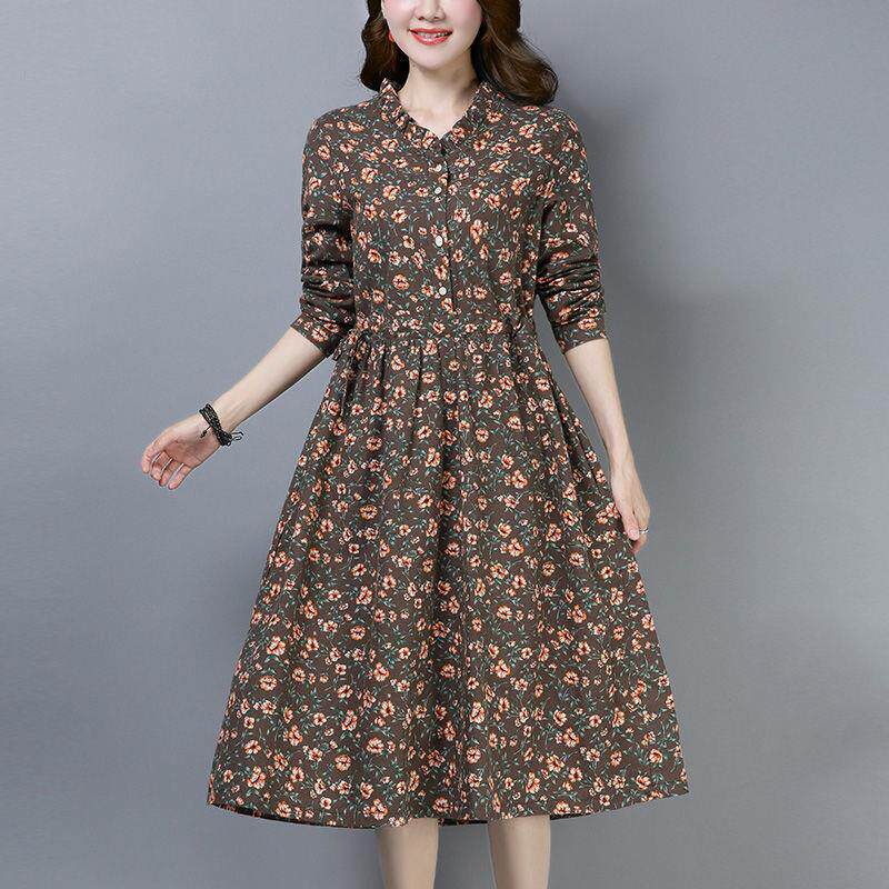 📚 碎花连衣裙长秀秋装新款棉麻口袋收腰翻领妈妈大码女装中老年群子