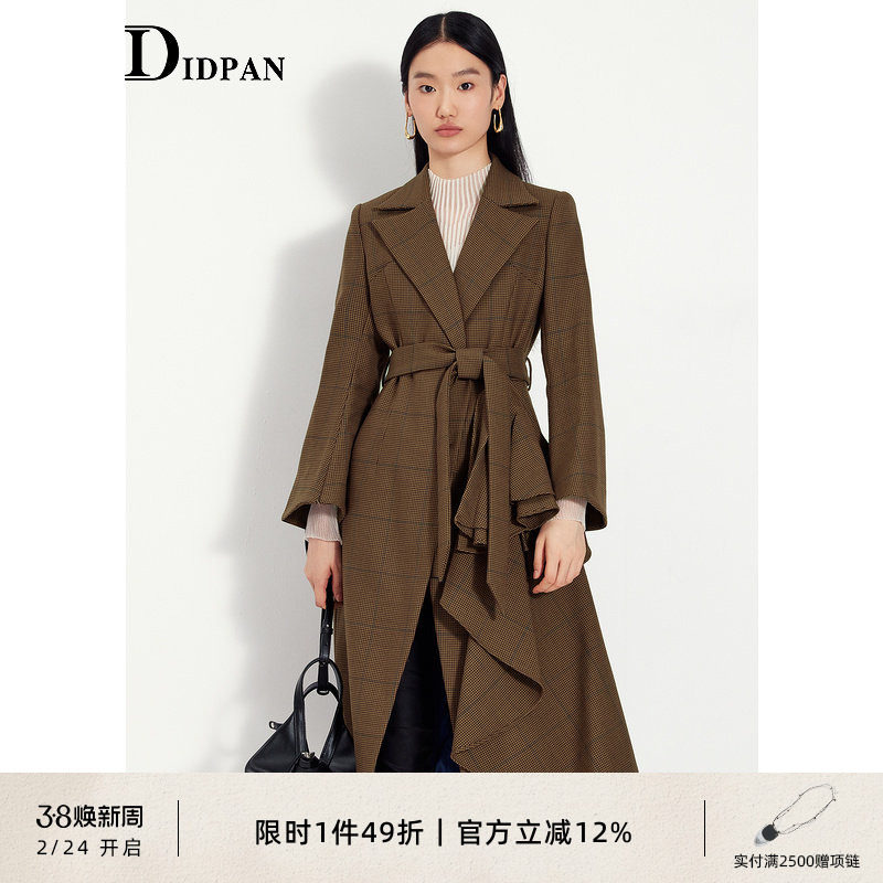 📚 IDPAN女装冬季新款通勤千鸟格荷叶边设计长款大衣毛呢外套女