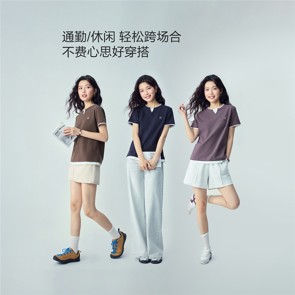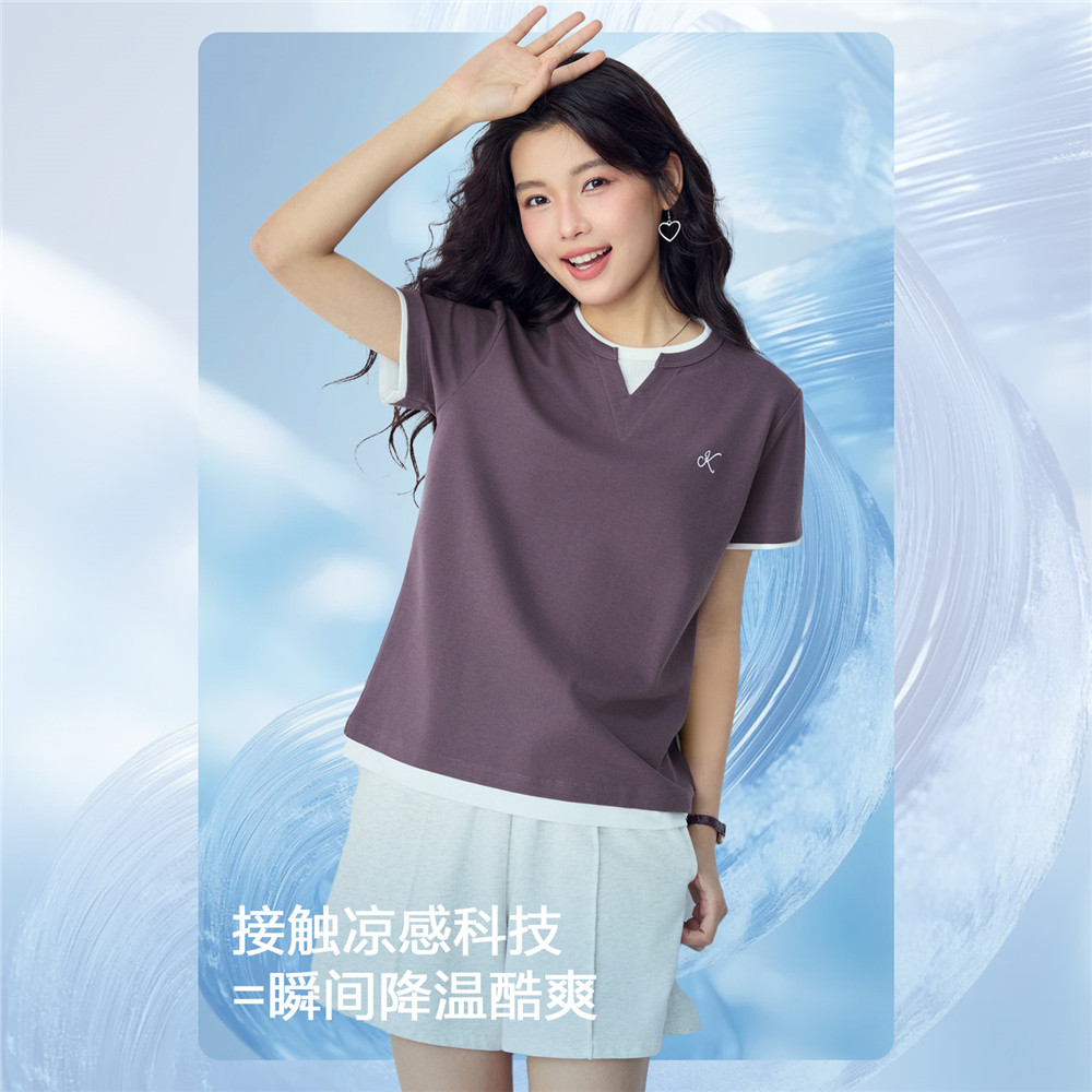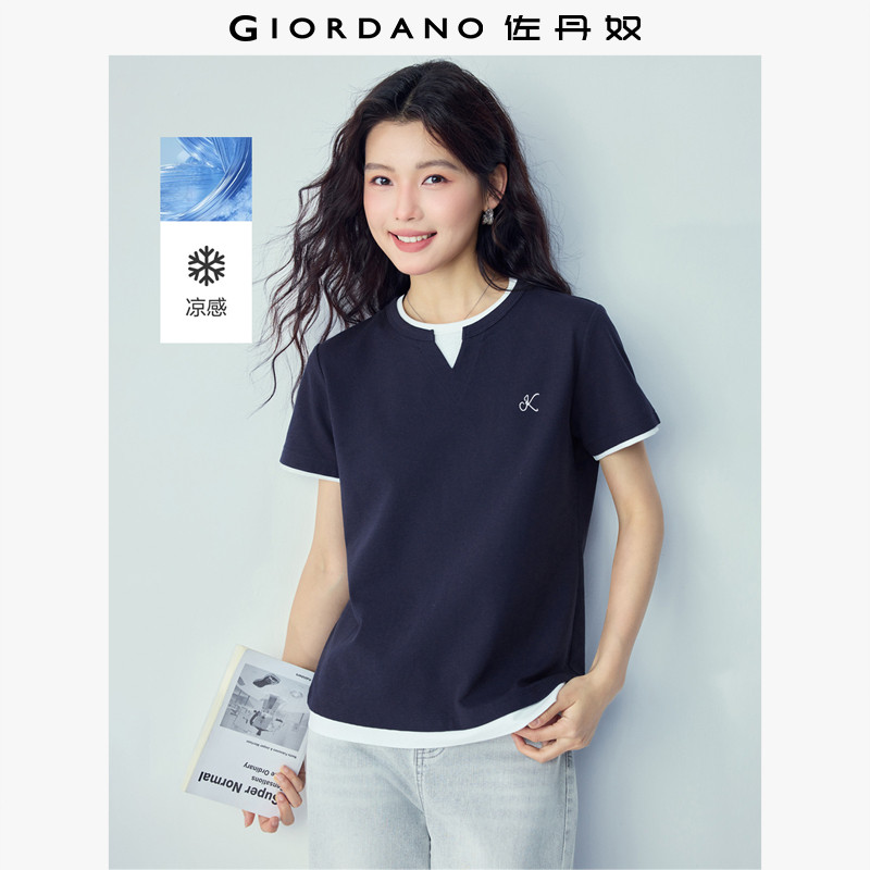 📚 佐丹奴2026年夏季新款假两件撞色刺绣圆领针织短袖T恤女13326271