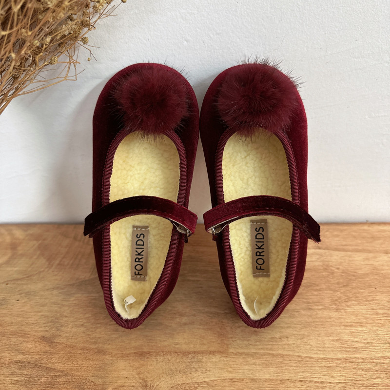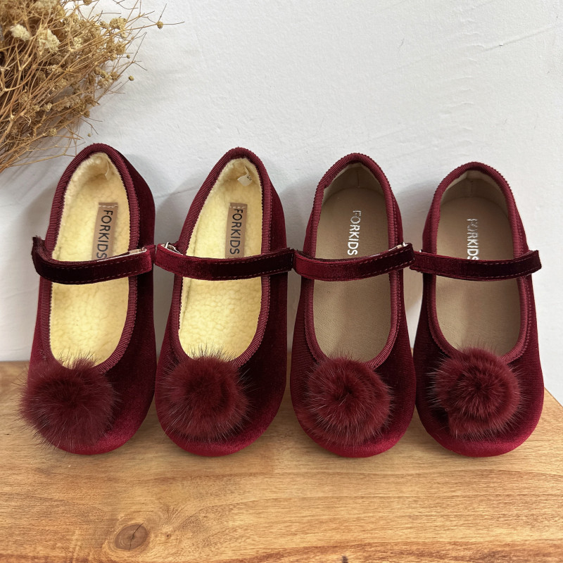 📚 韩版童鞋2024女童冬季新款金丝绒毛球公主皮鞋儿童新年红色棉鞋潮