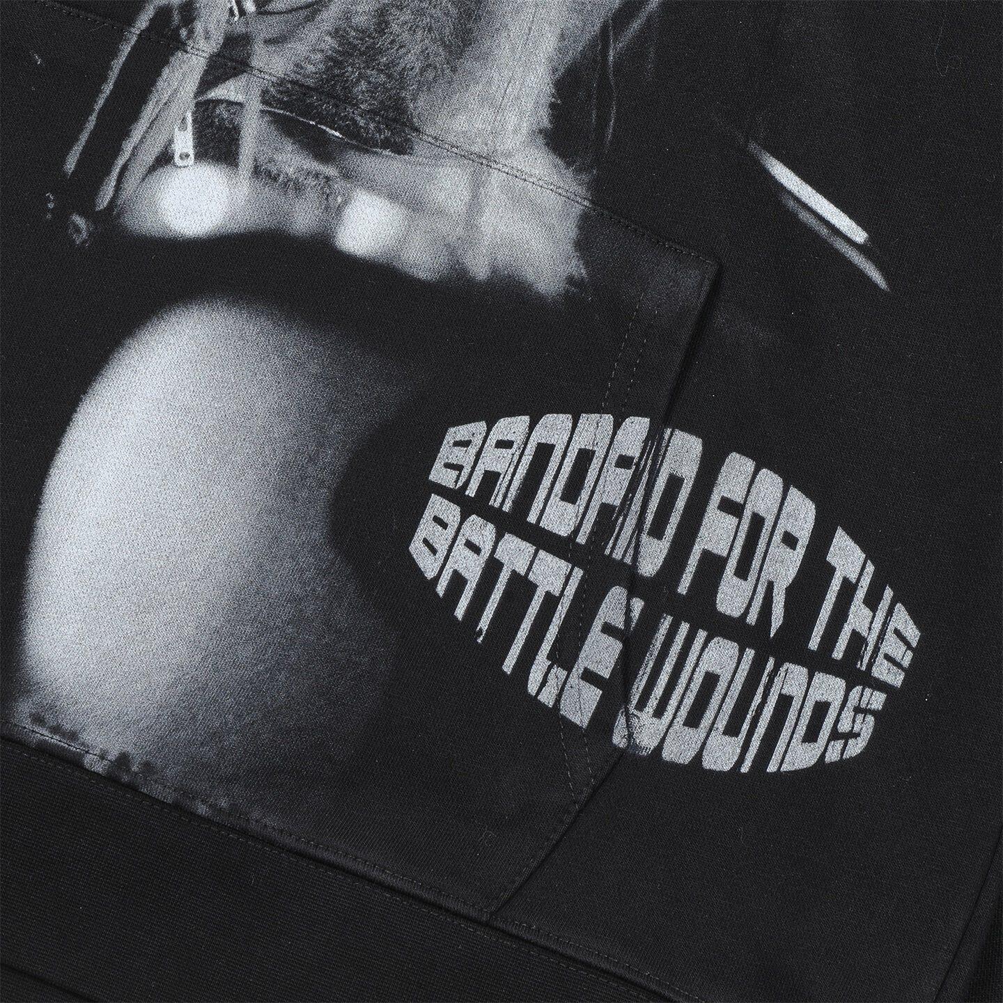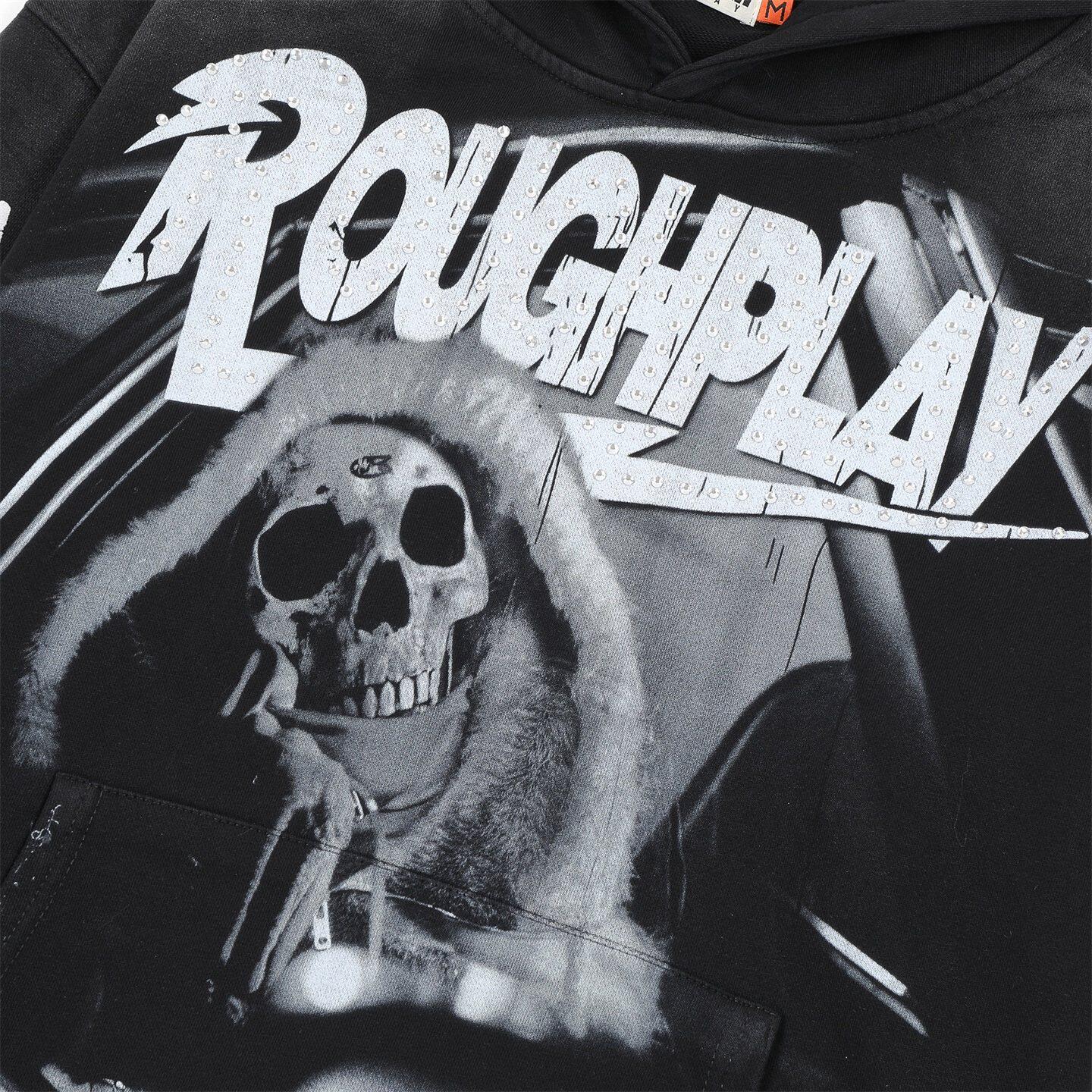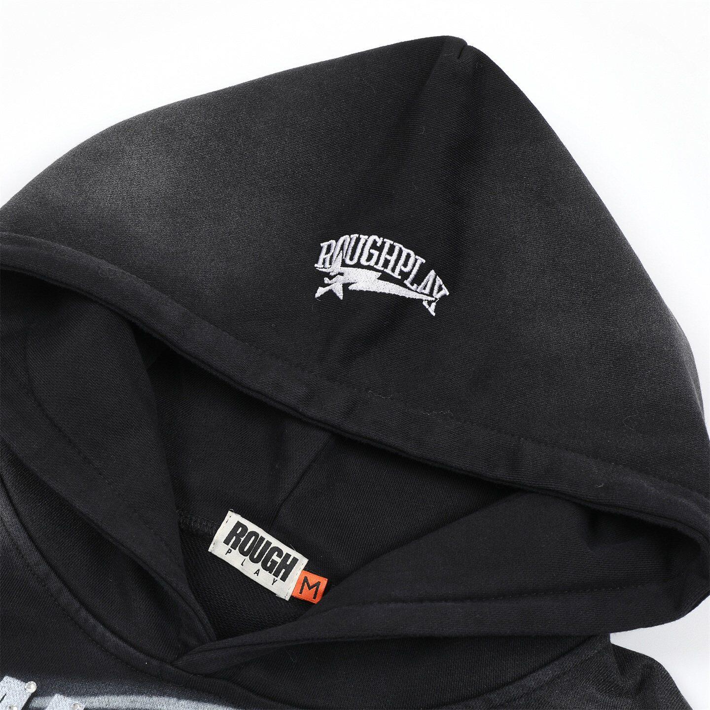 📚 RoughPlay白墨直喷印花烫钻帽衫男女款宽松洗水做旧套头卫衣外套