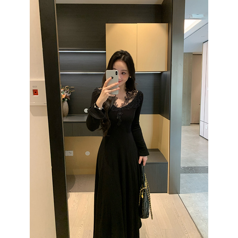 📚 XINYI【图卢兹午后】秋冬蕾丝边高弹加厚内搭针织连衣裙显瘦气质