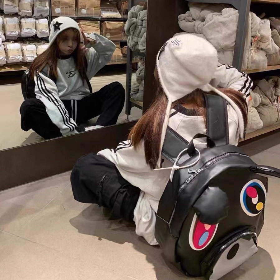 📚 网恋高手原创恶搞辍学熊黑PU皮双肩包大容量书包情侣款卡通背包