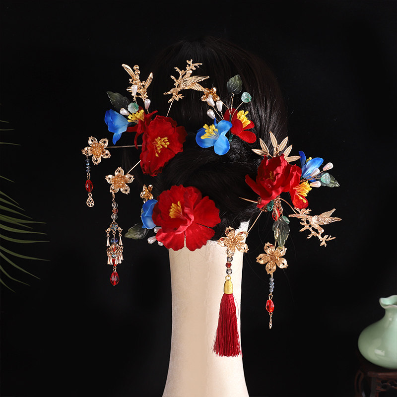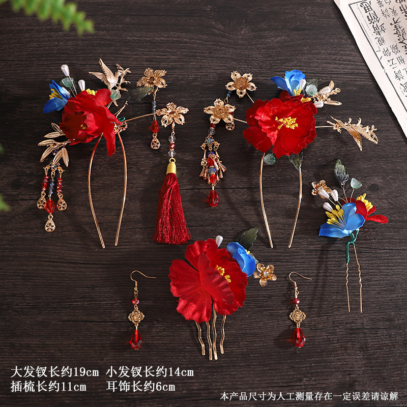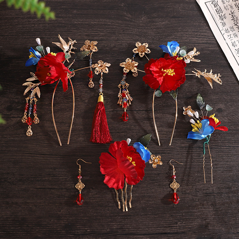 📚 新中式秀禾新娘发饰套装超仙布艺花朵发簪插梳头饰敬酒服晨袍饰品