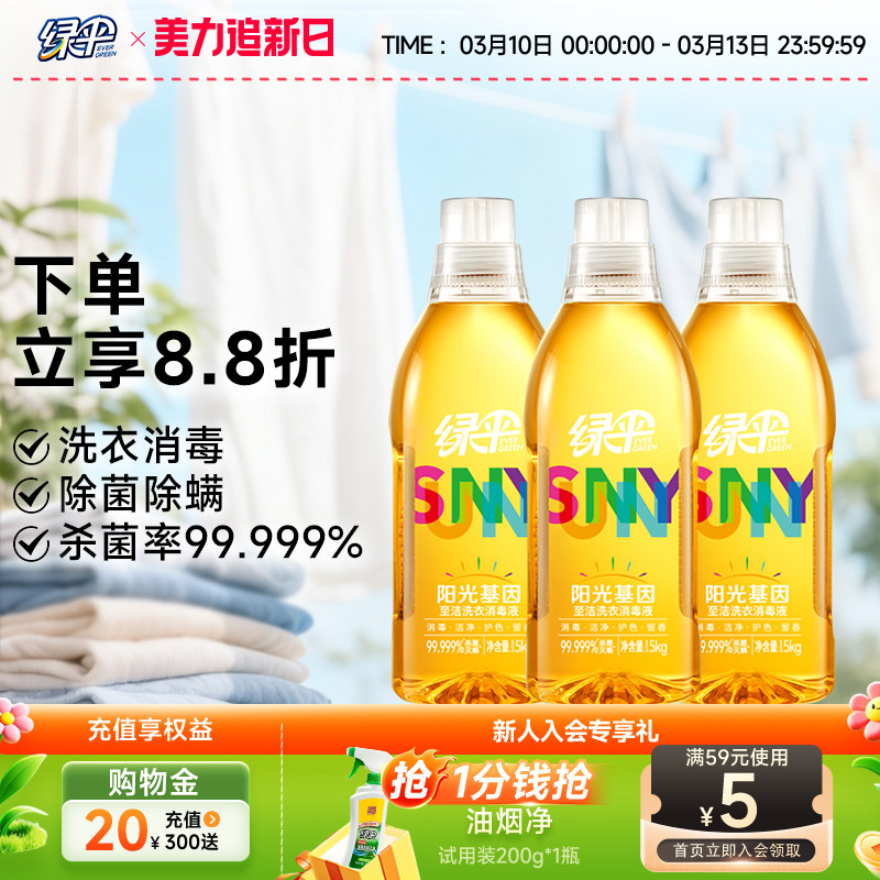 📚 【绿伞】绿伞阳光基因洗衣液1.5kg*3瓶衣物消毒除菌液除螨洗衣液