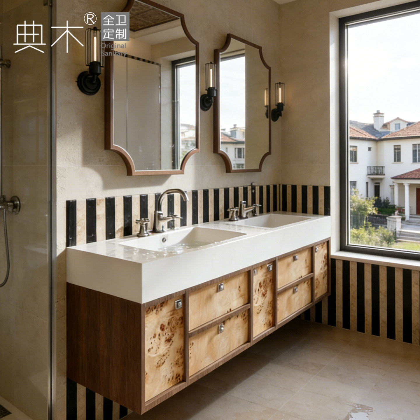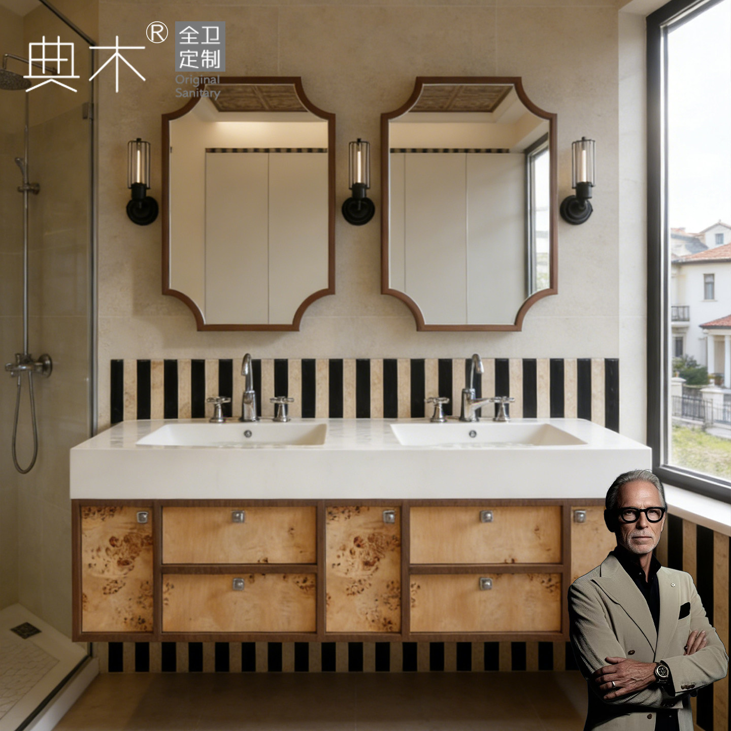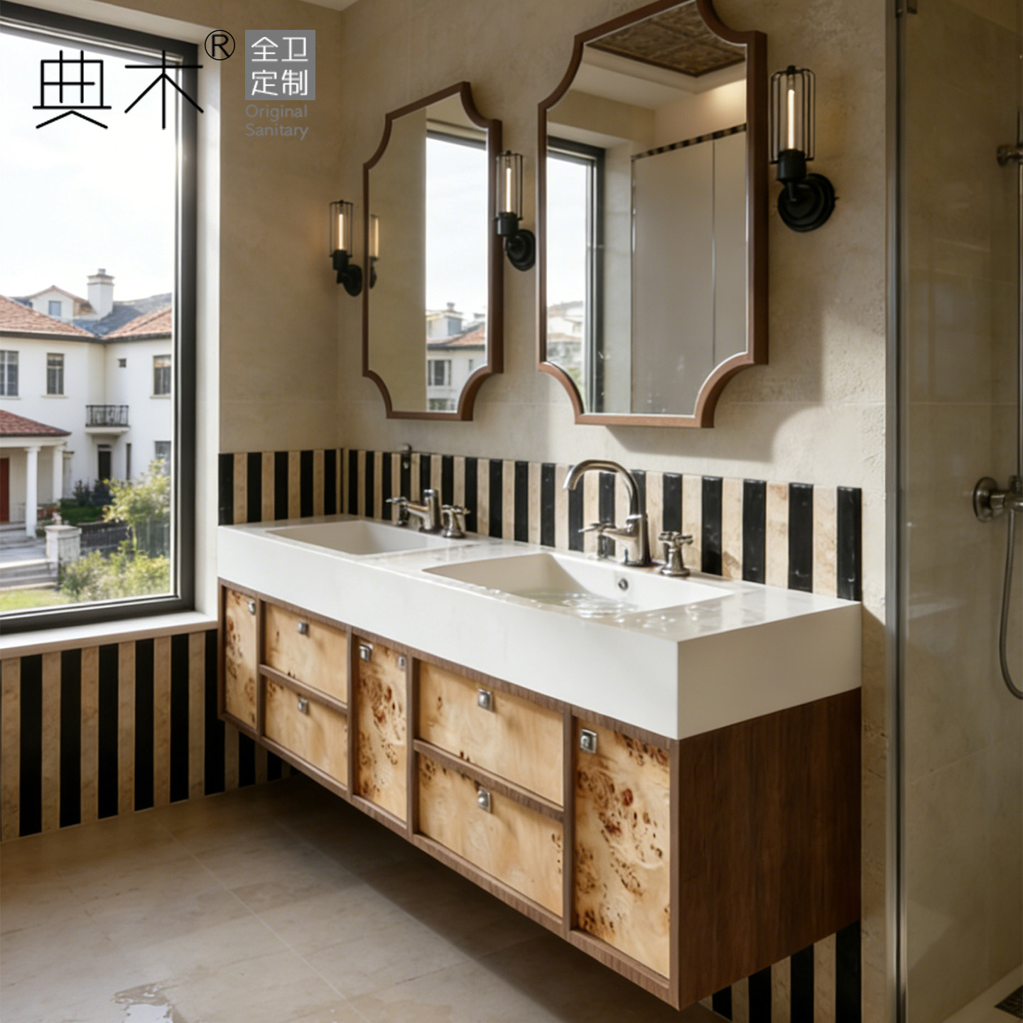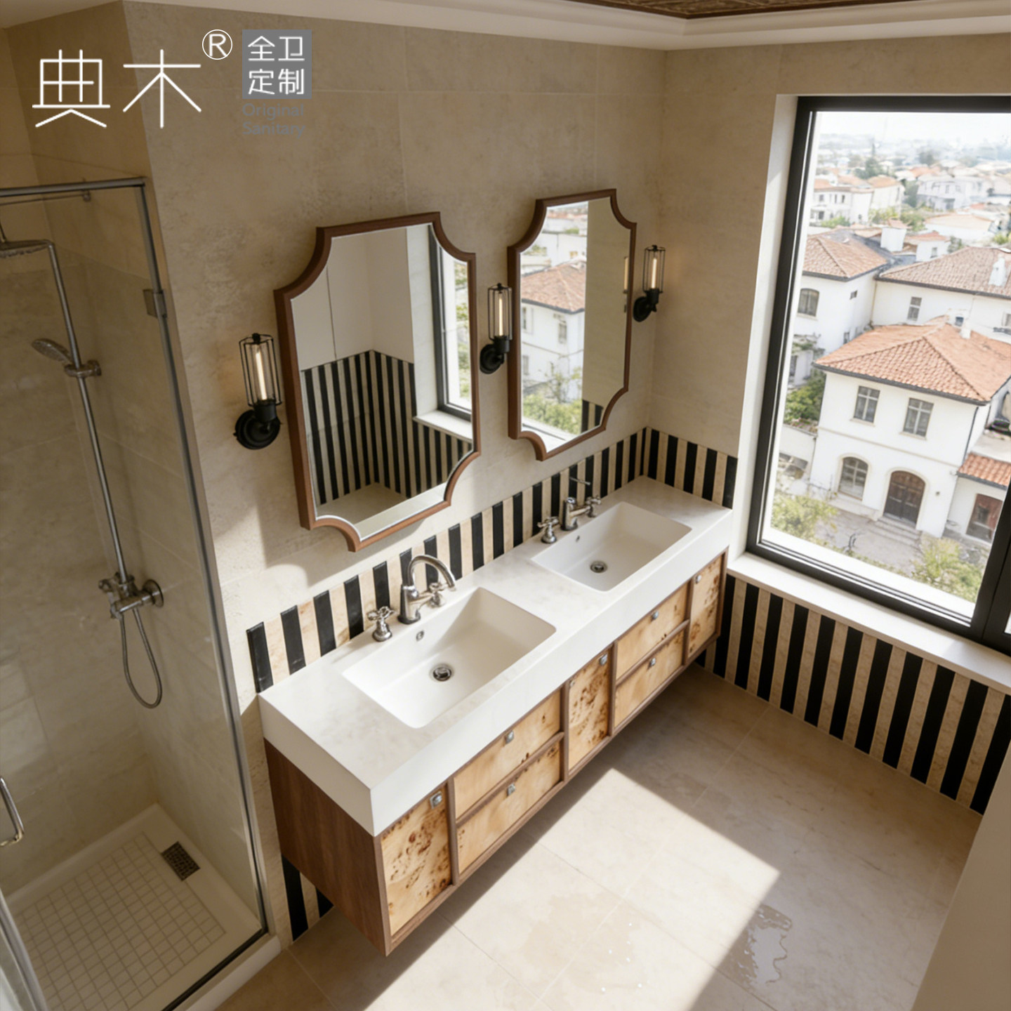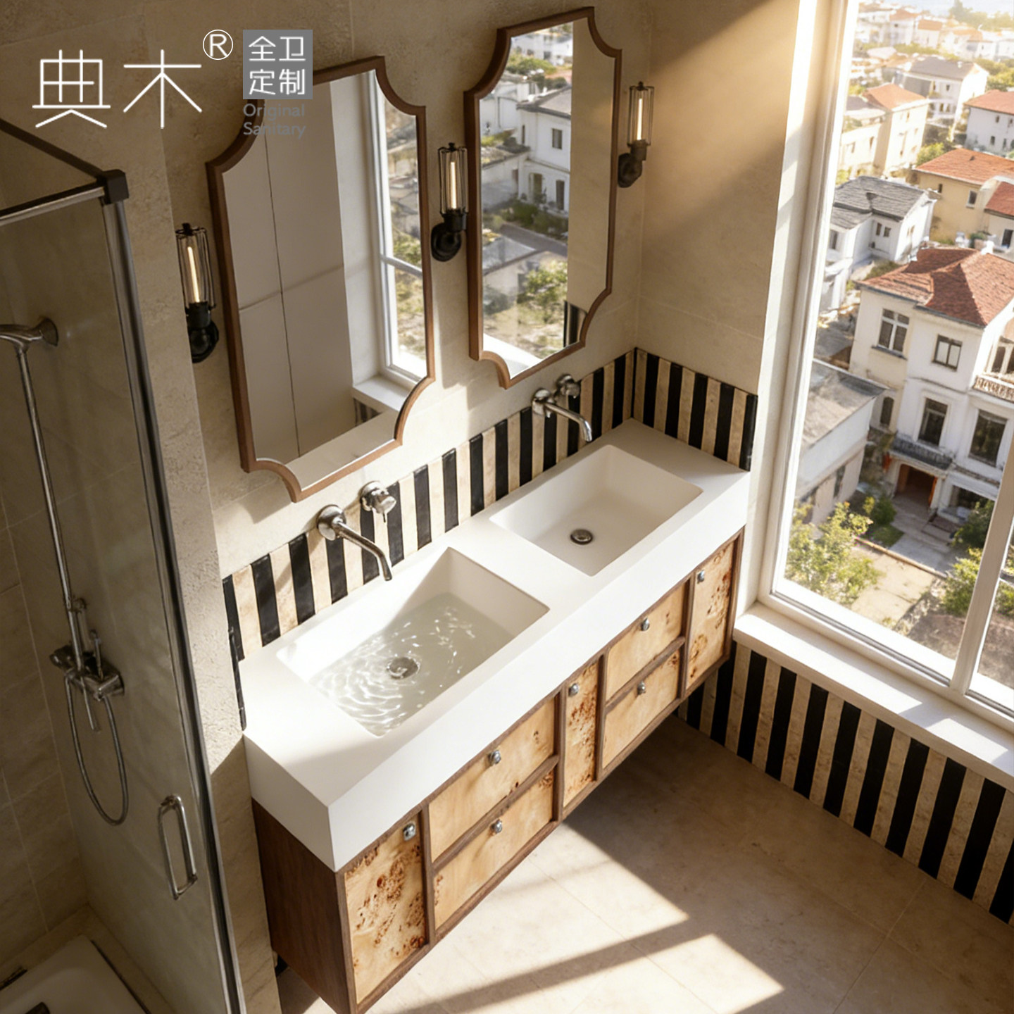 📚 2026新款浴室柜中古风岩板热弯陶瓷一体盆老钱风双台盆卫浴柜定制