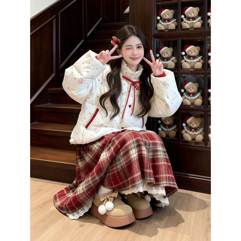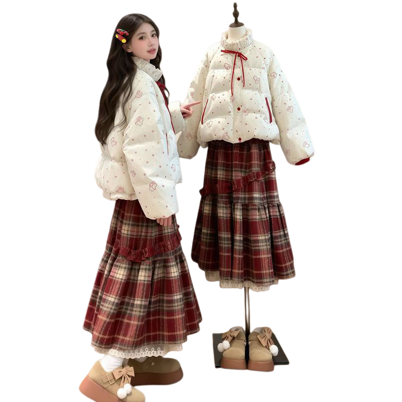 📚 法式温暖甜美风米白色立领印花棉服搭配高腰宽松格纹长裙两件套装