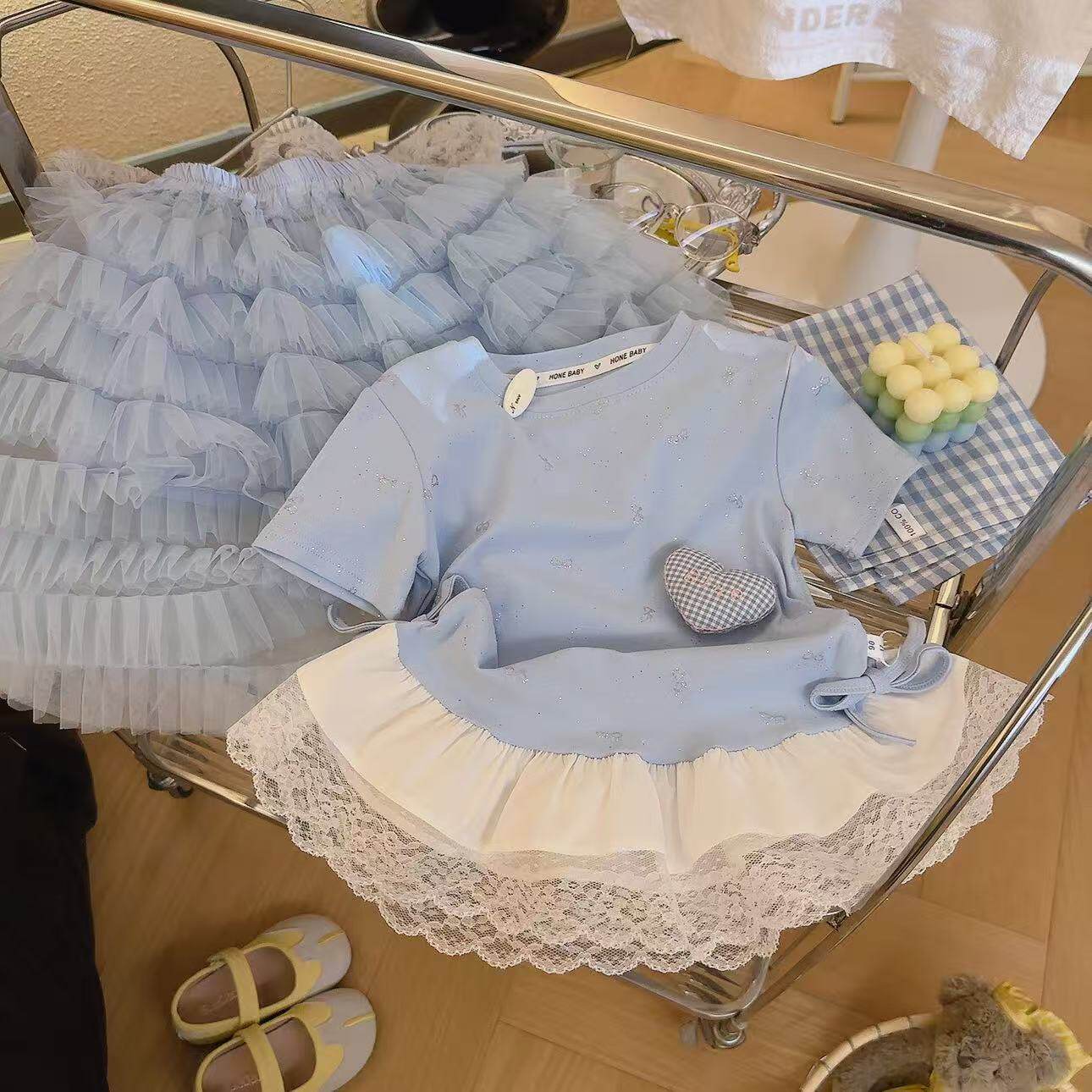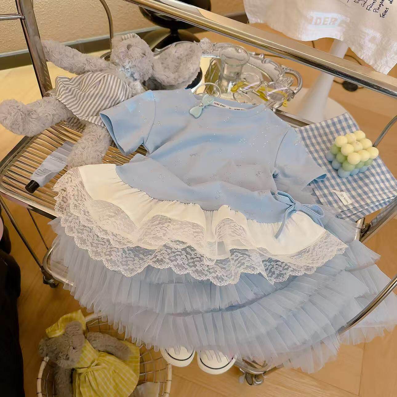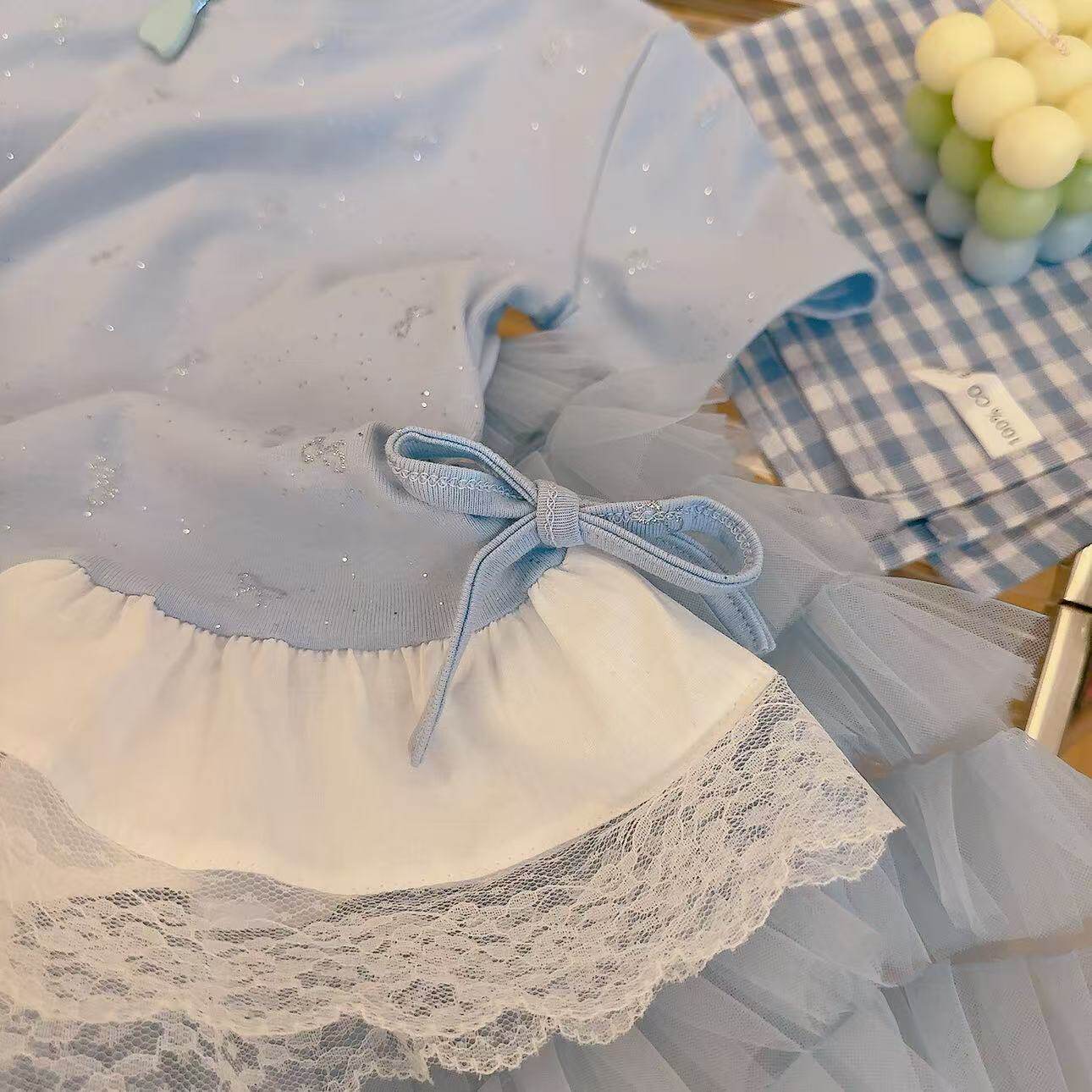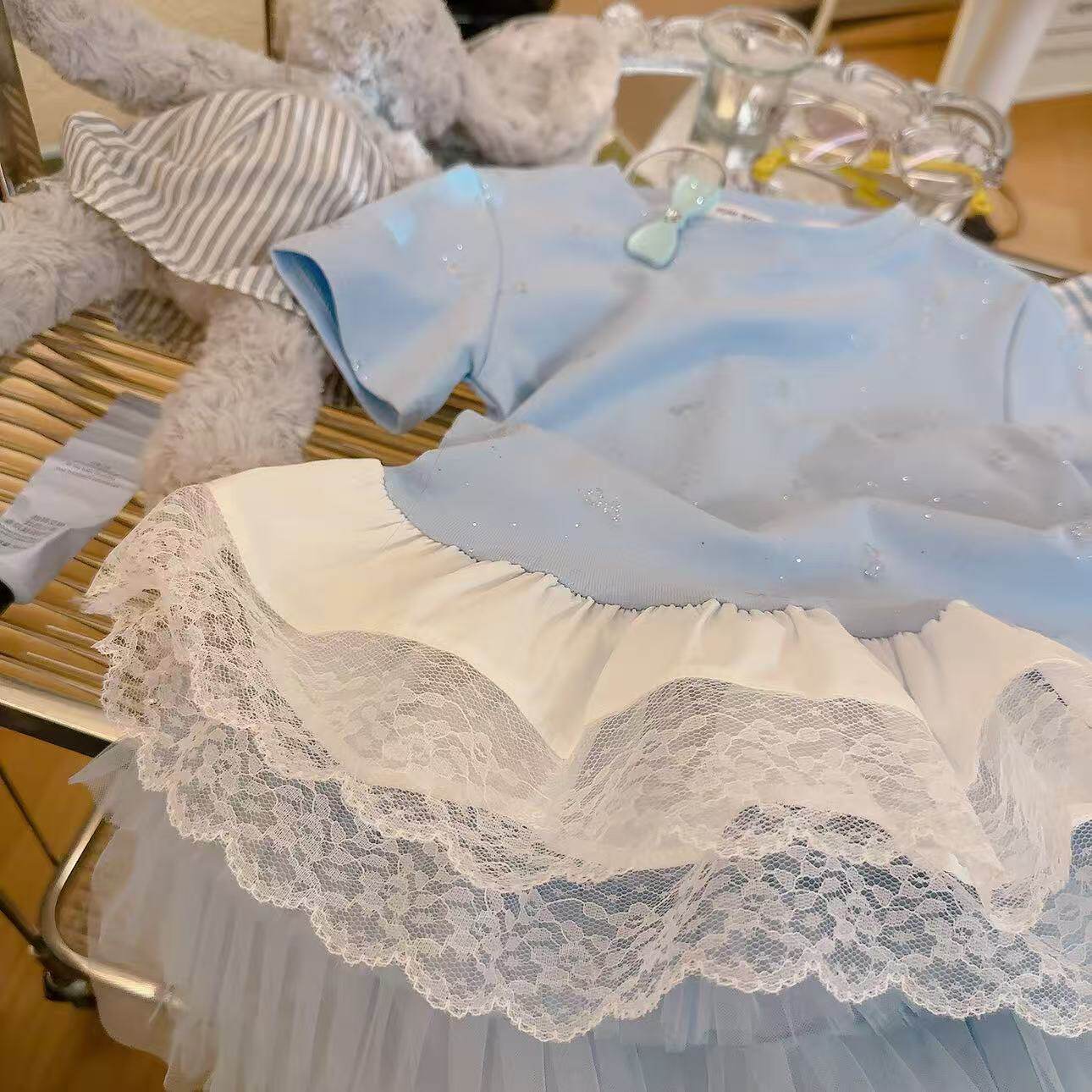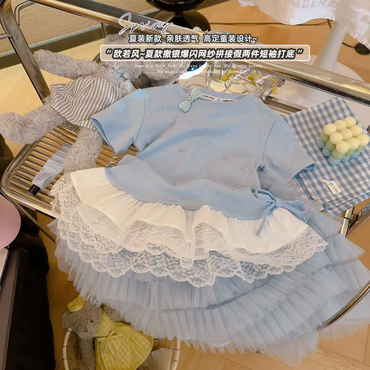 📚 女童欧若飞撒银蝴蝶结网纱拼接时尚洋气T恤2026夏季DP新款5007