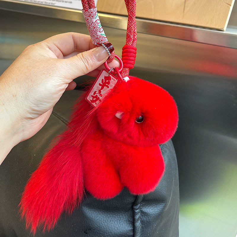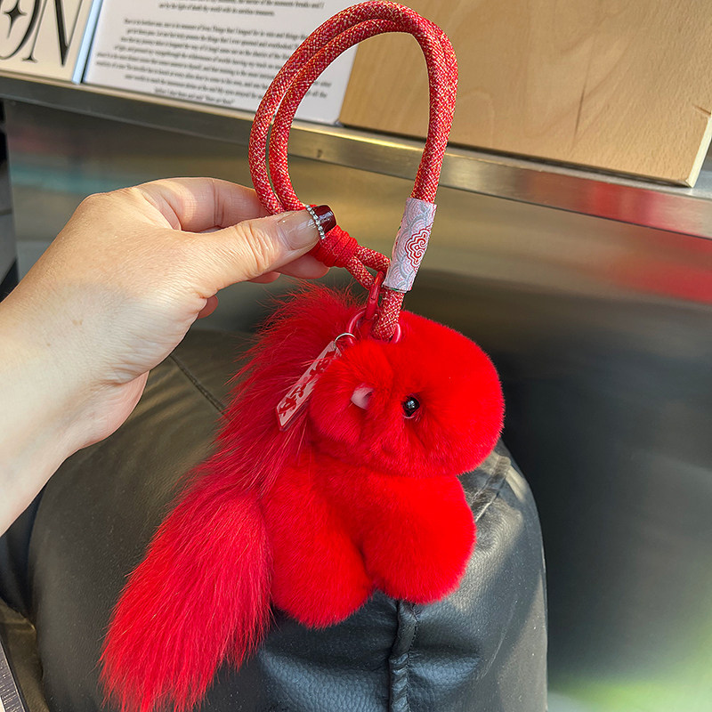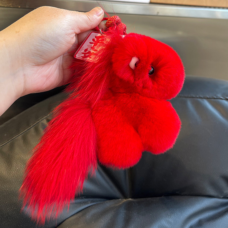 📚 红色真獭兔毛小马钥匙扣挂件毛绒包包挂饰马上平安喜樂高档礼物