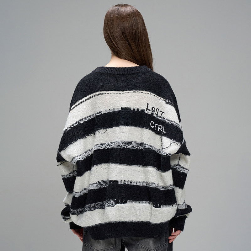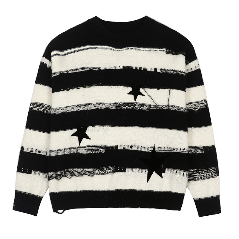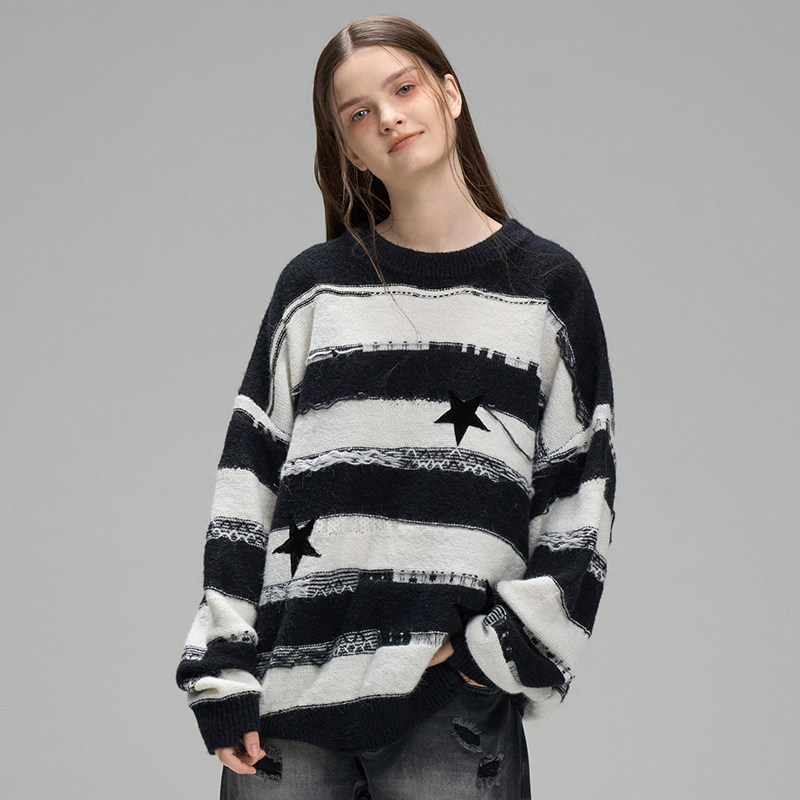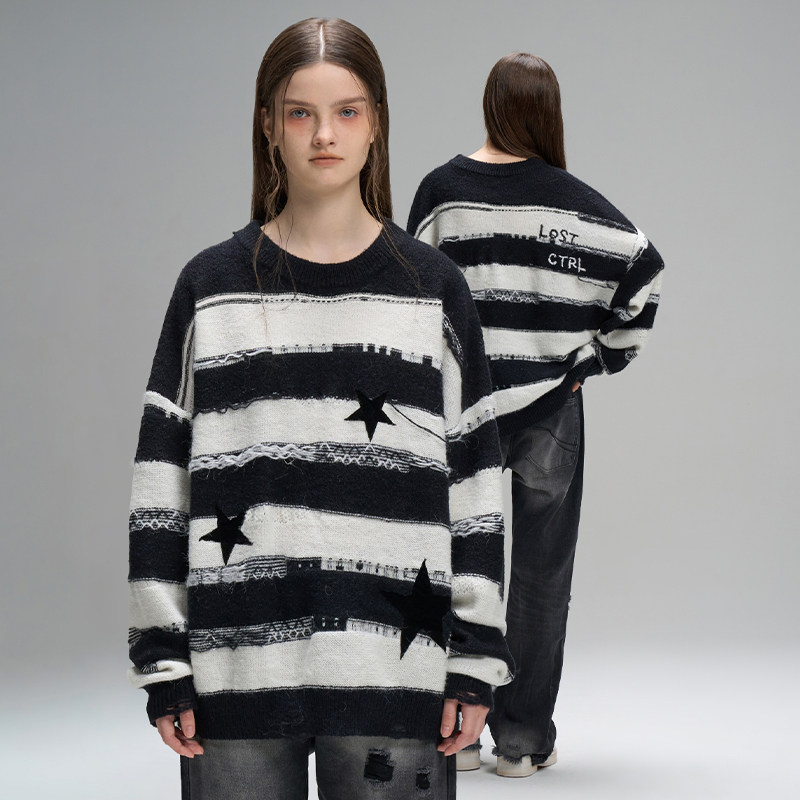 📚 LOSTCTRL「黑夜星辰」星星贴布刺绣条纹毛衣男女同款秋冬针织衫潮