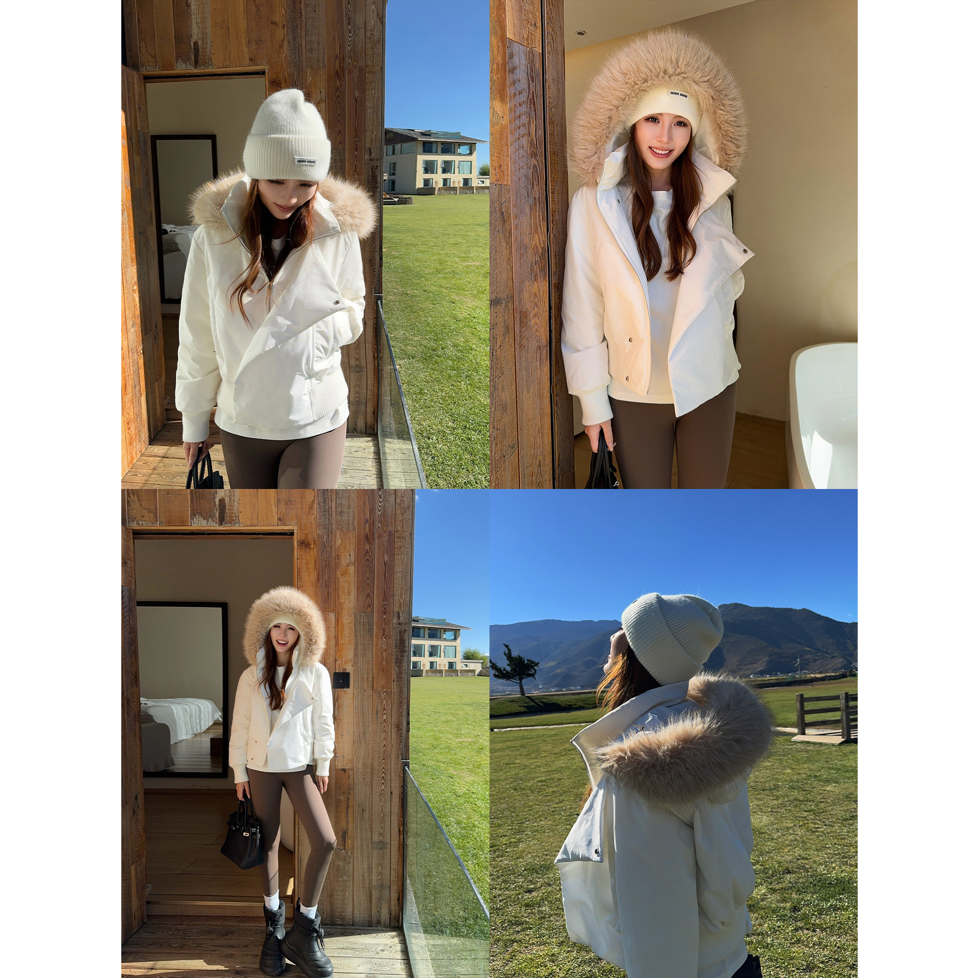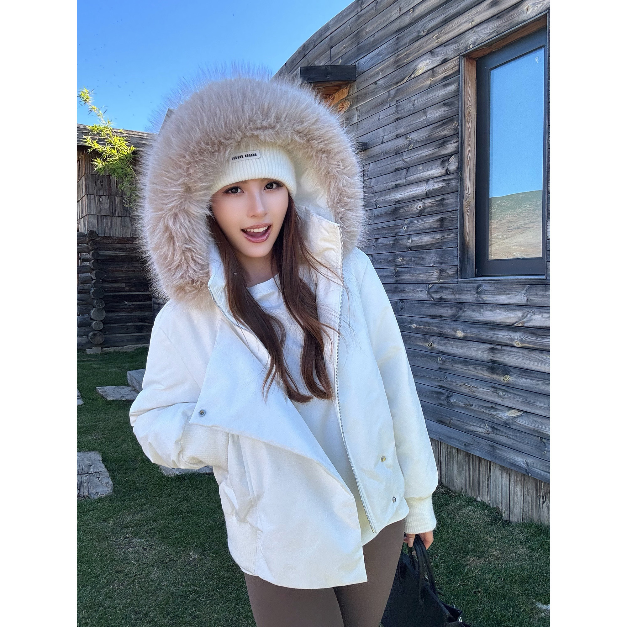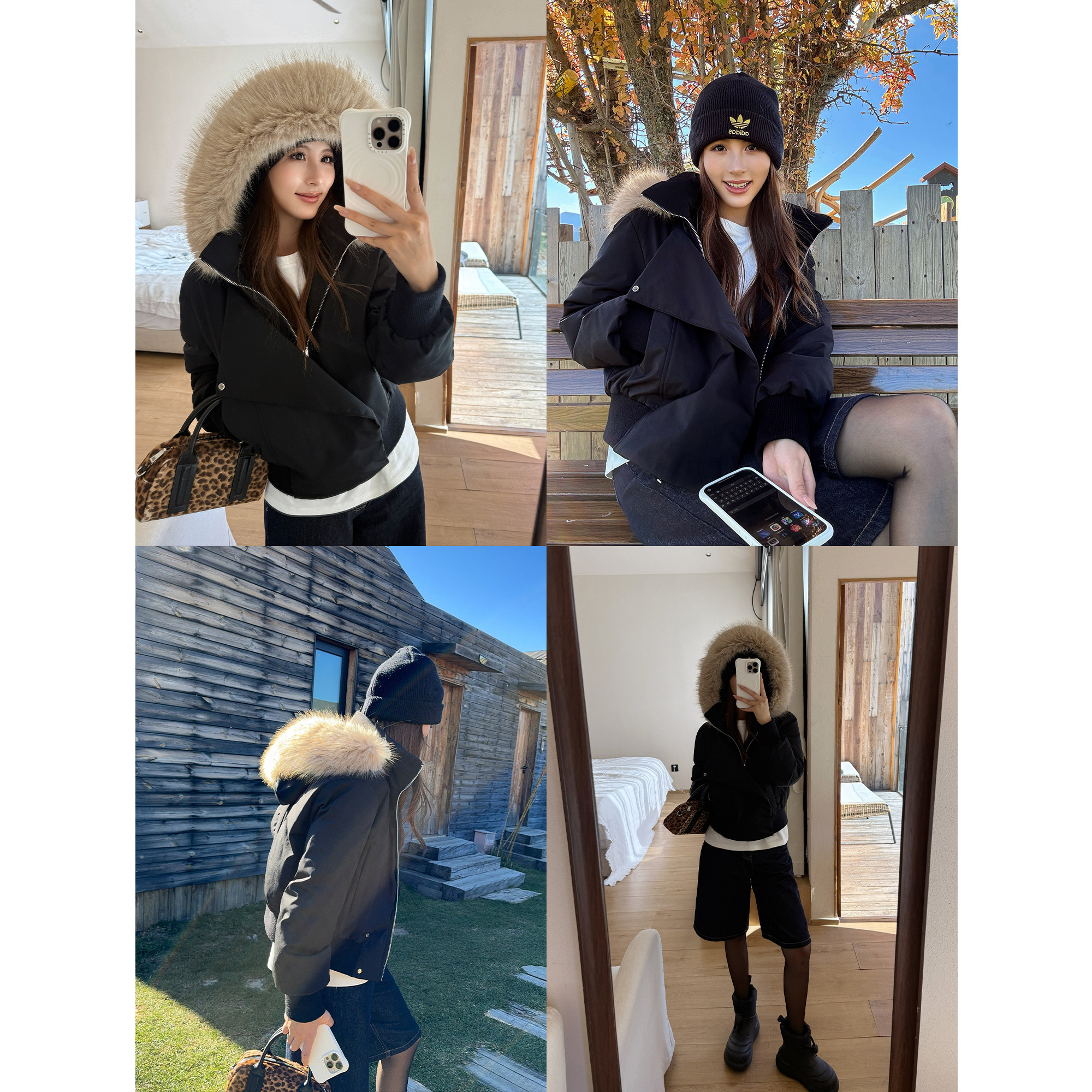 📚 NEVA HU 暮色黑简 毛领连帽短款羽绒服女设计感派克收腰羽绒外套