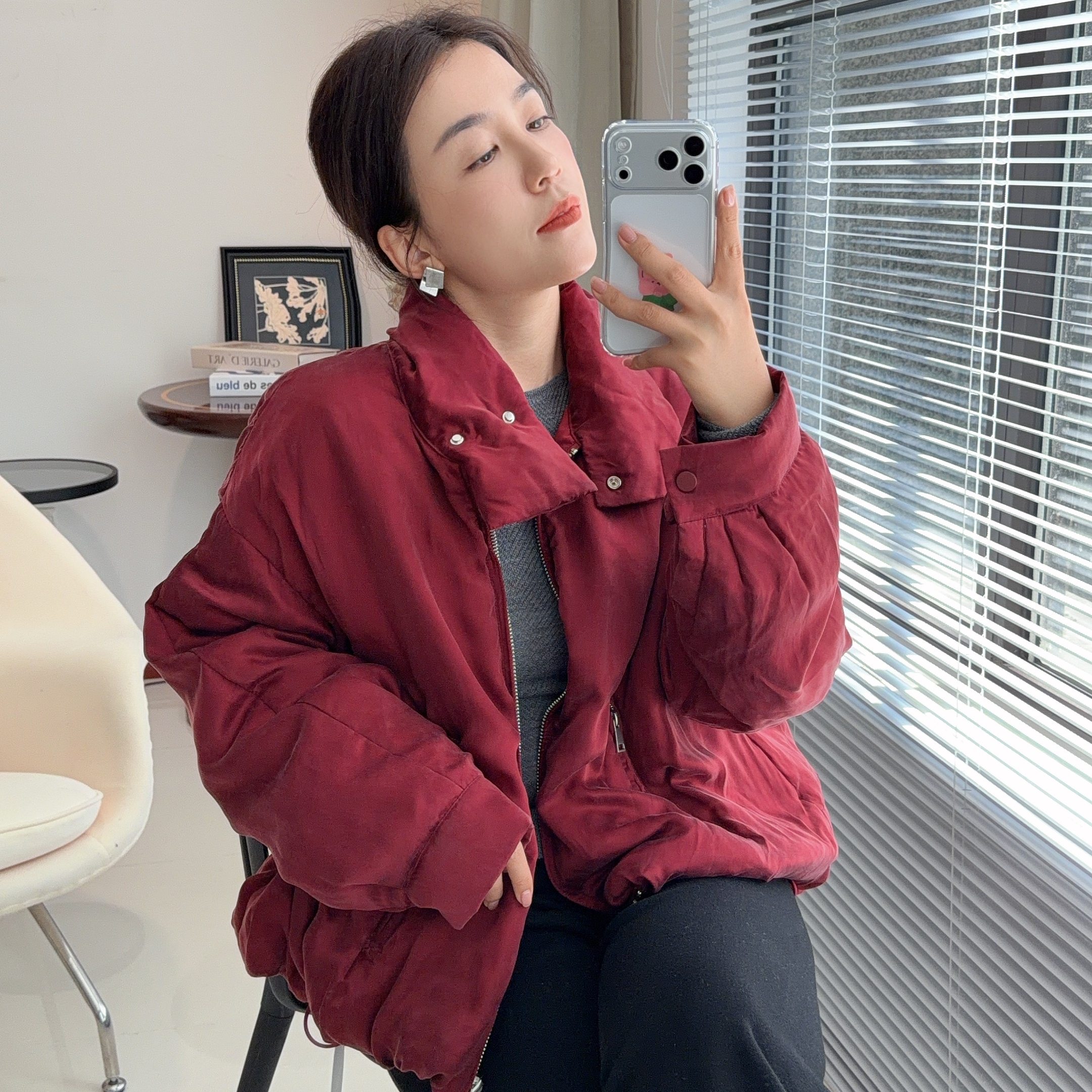 🎉标题:欧洲站新宠!立领酒红短款猫头鹰羽绒服,券后仅1371元,温暖如春🍃