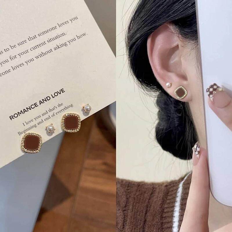 📚 s925银针耳饰美拉德咖色小方块珍珠耳钉四件套精致小巧养耳洞耳环