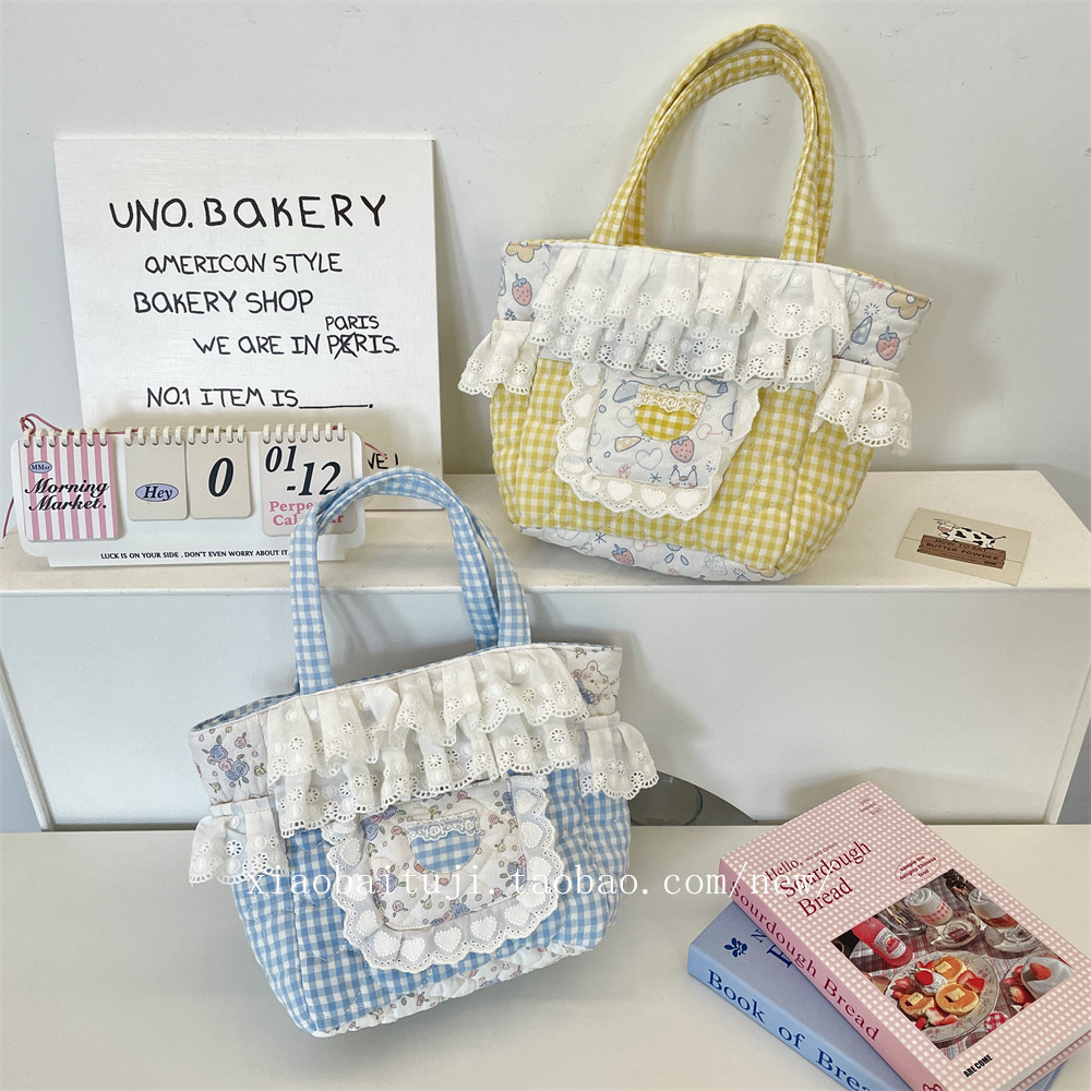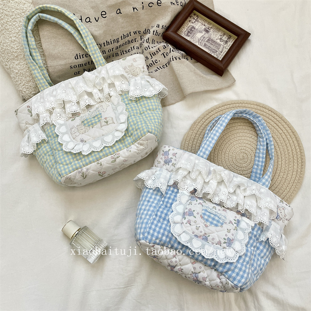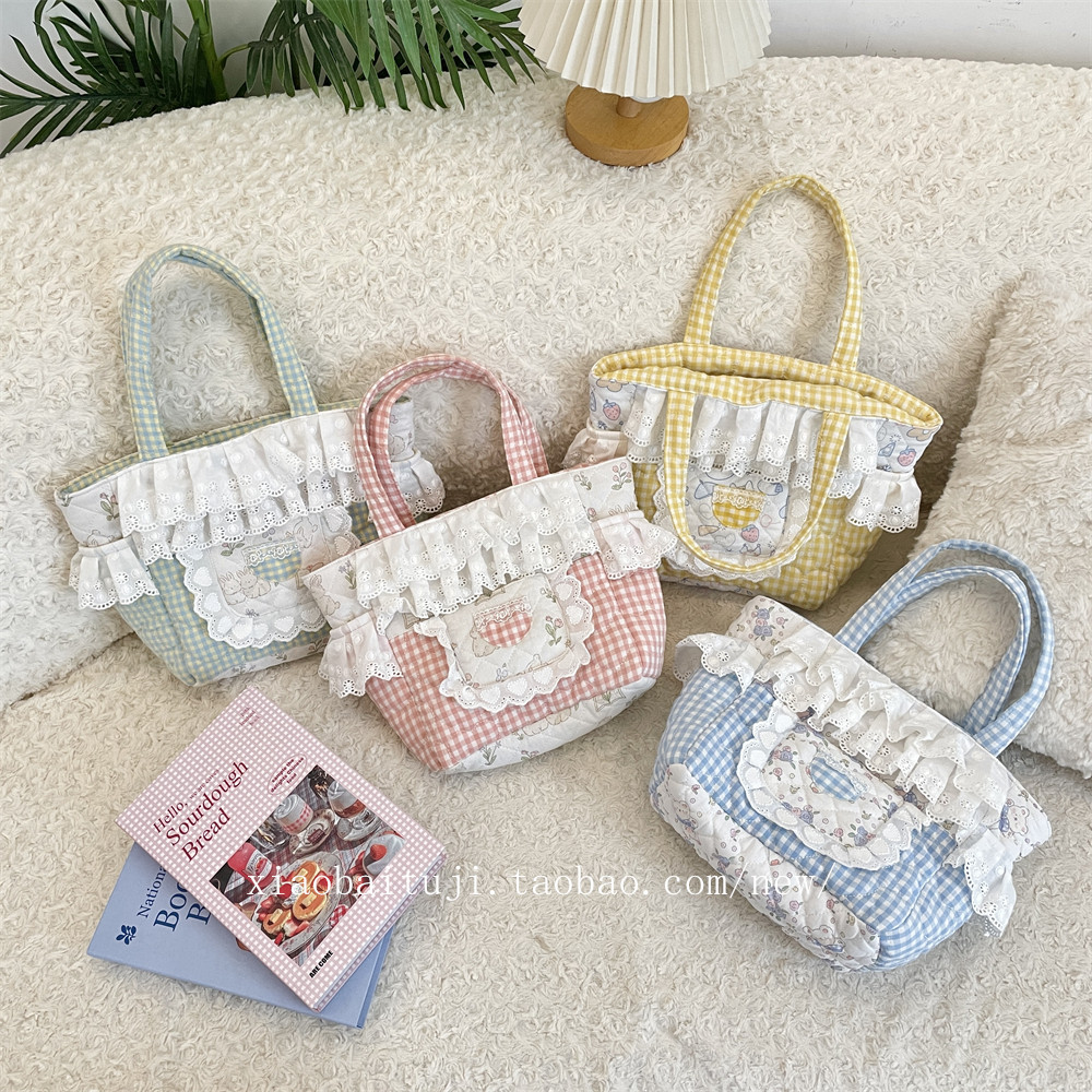 📚 小白兔几2025新款韩版格子款清新手提包蕾丝手拎包通勤整理手提包