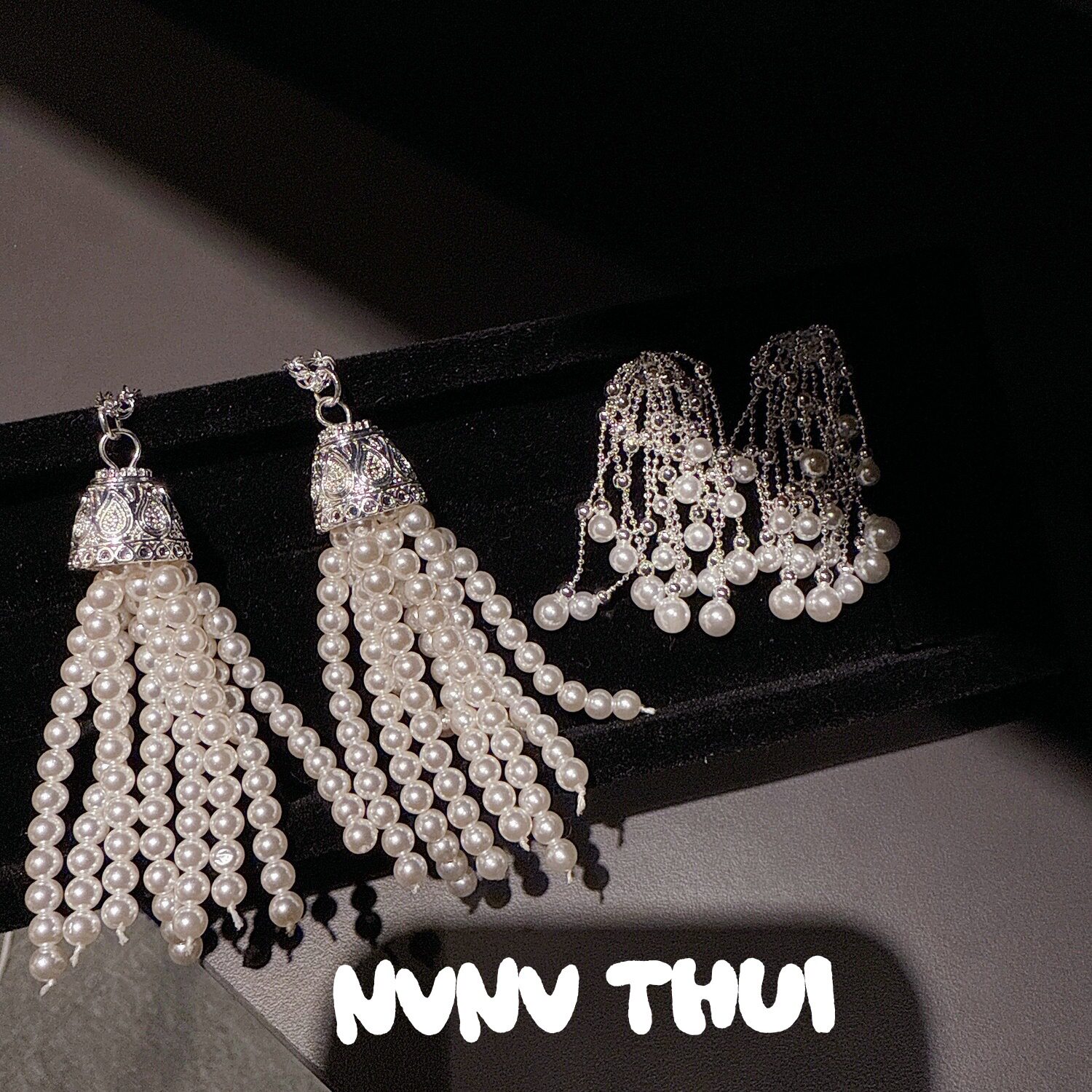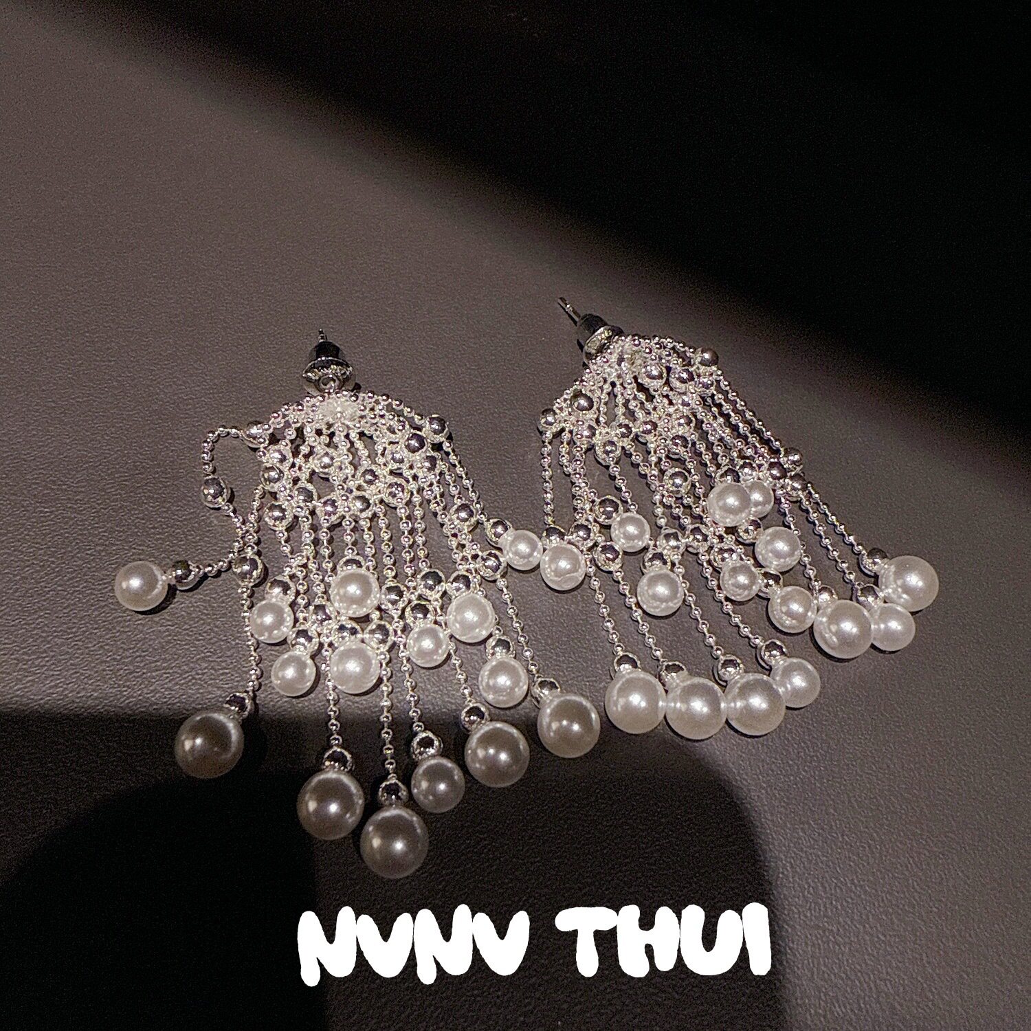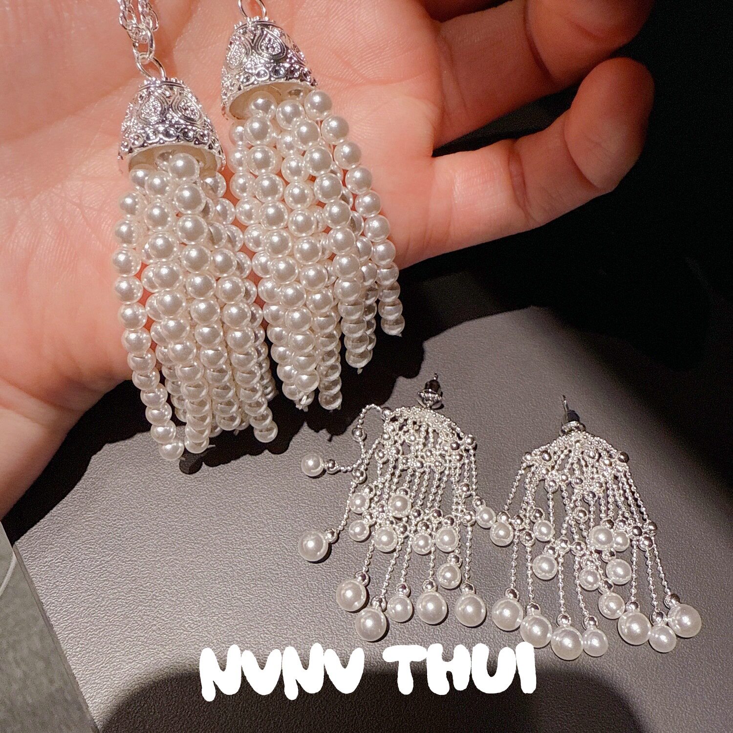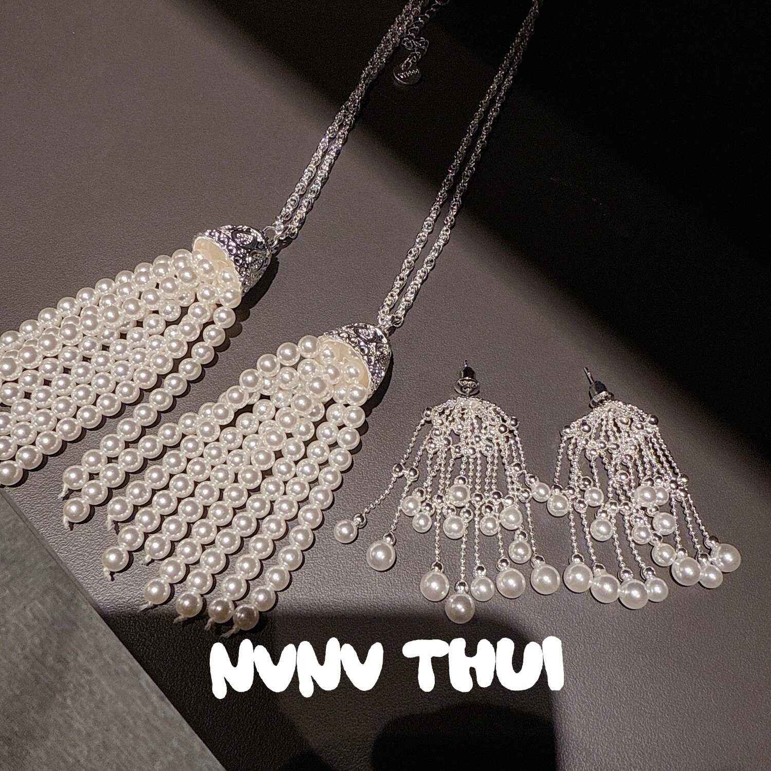 📚 珠宝 露思珠帘吊灯流苏耳环 晚宴高定澳白色小米珠流苏毛衣链套装