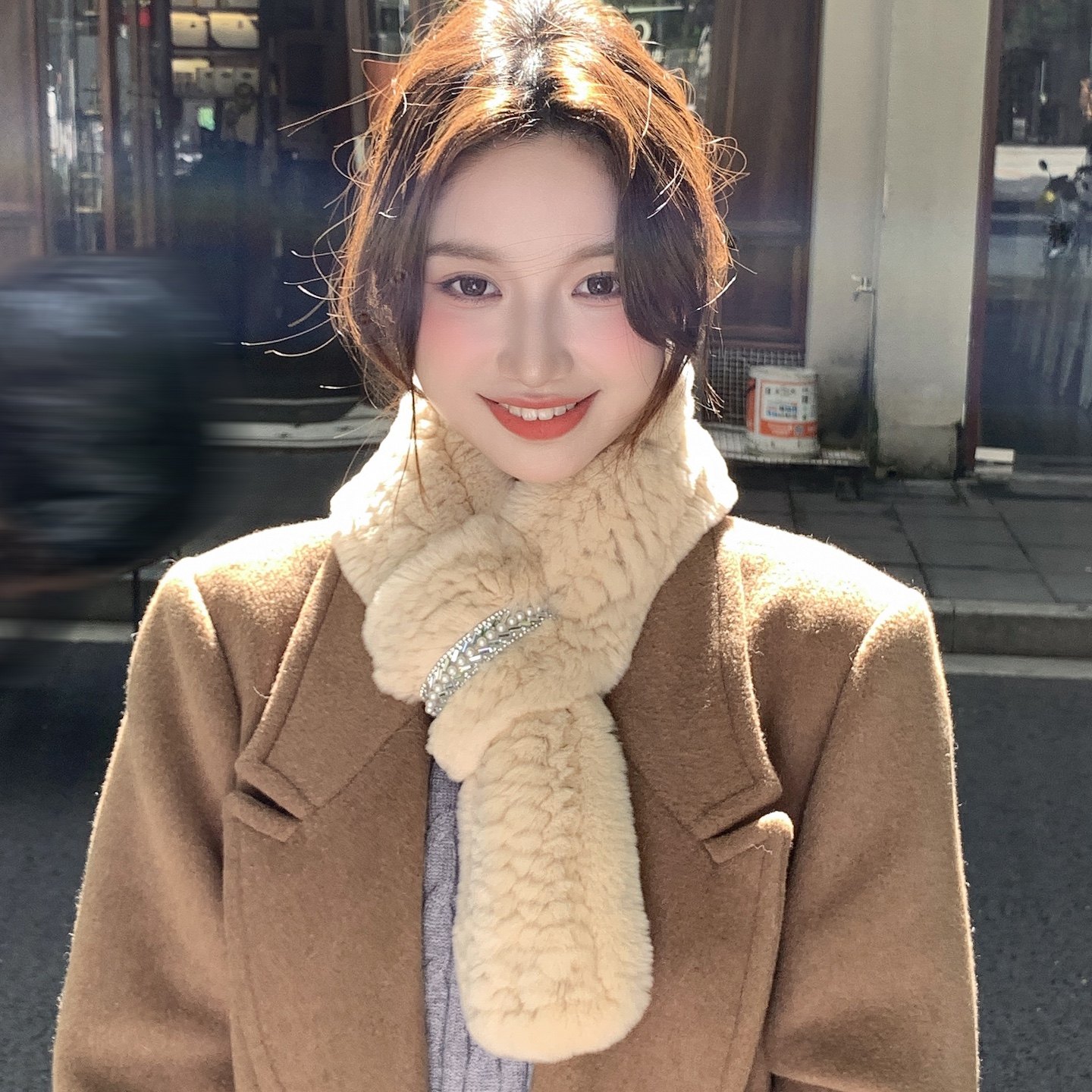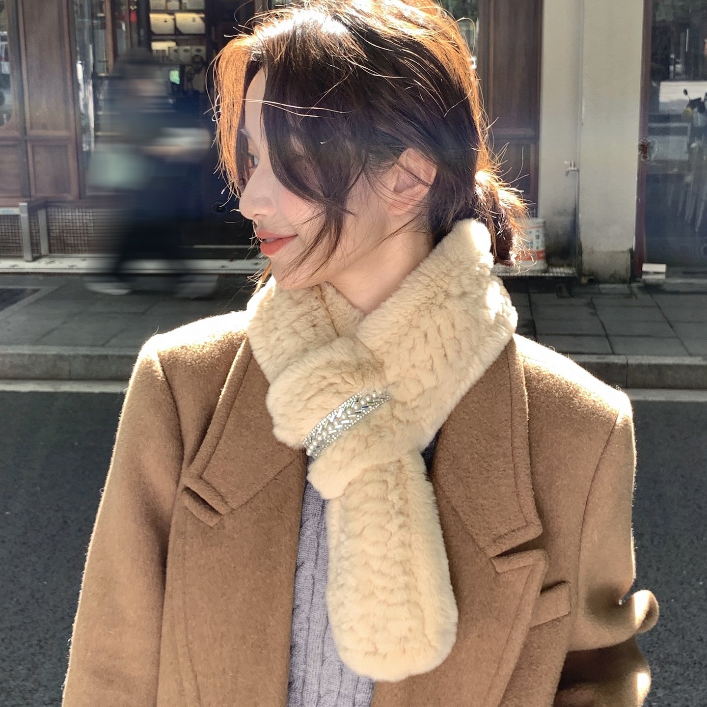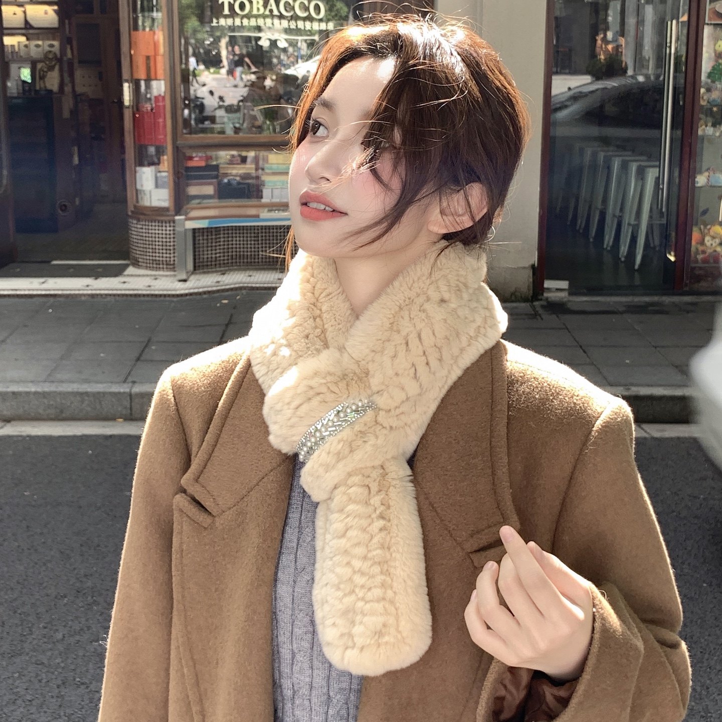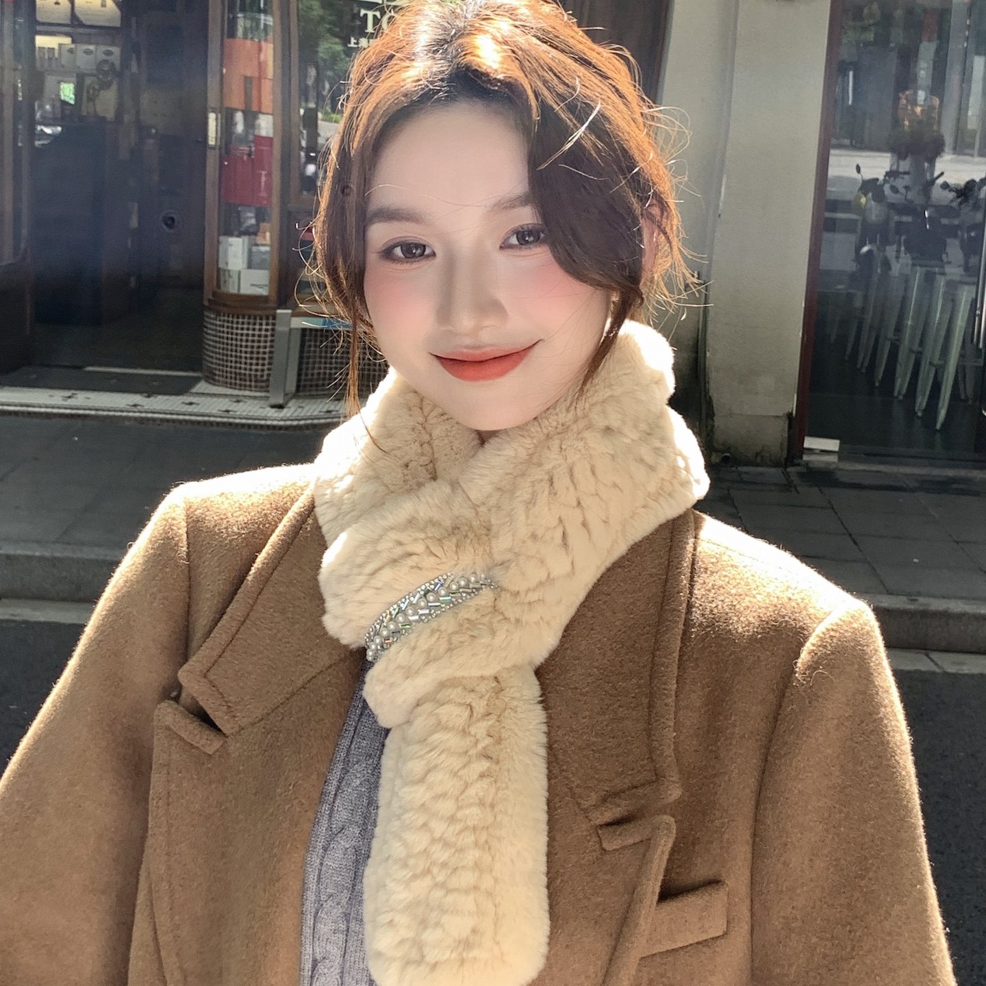 📚 秋冬保暖皮草围巾女獭兔毛绒双面编织水钻韩版百搭气质围脖