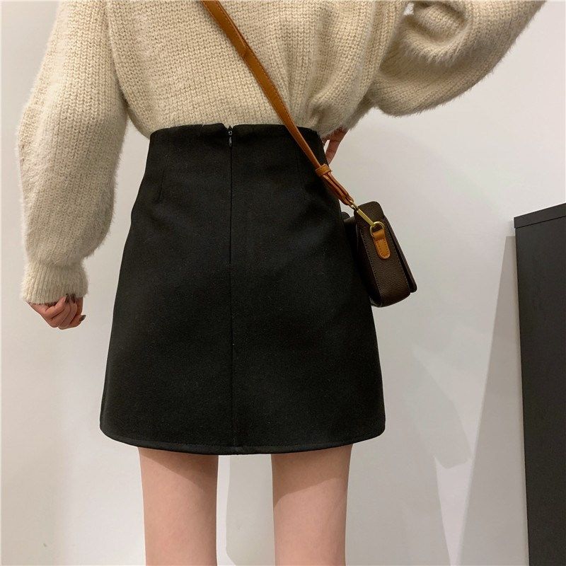 📚 大码黑色高腰开叉半身裙女秋冬新款a字短裙毛呢包臀裙子设计感潮