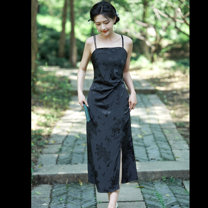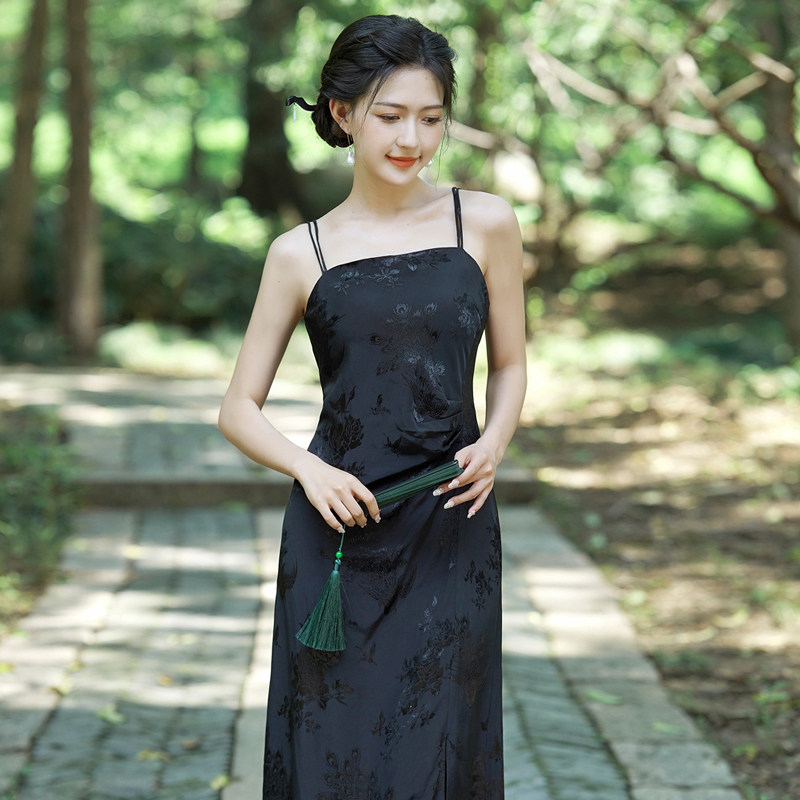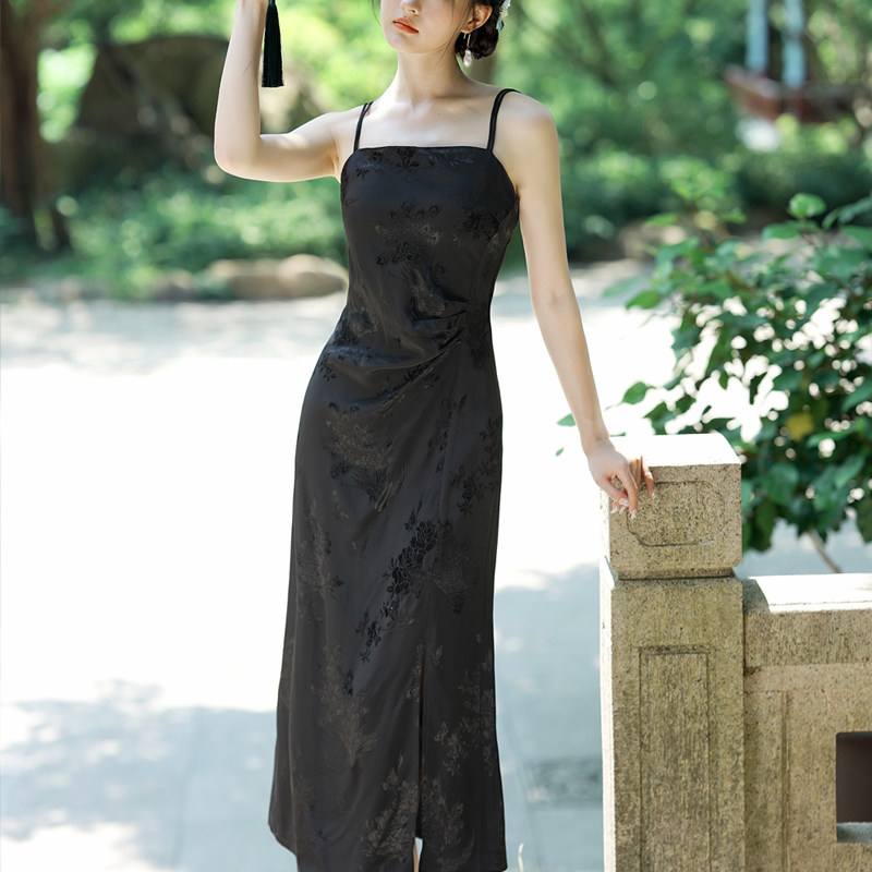 📚 倾城 夏季人丝提花缎面爽滑凉快新中式显瘦纸片人法式吊带连衣裙