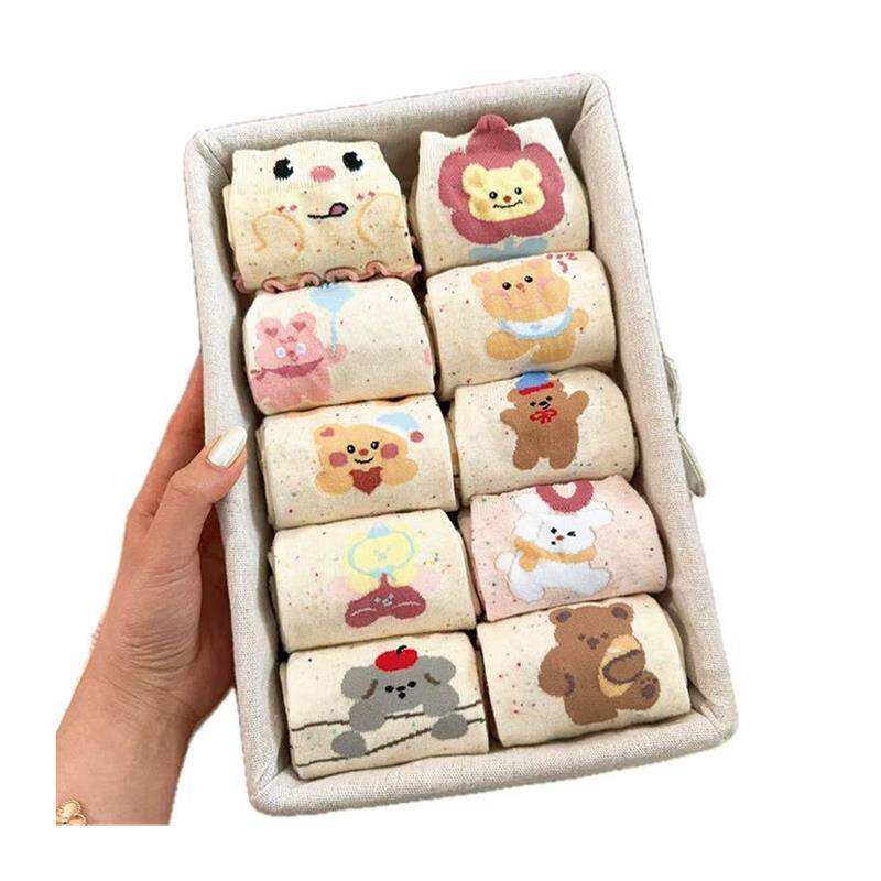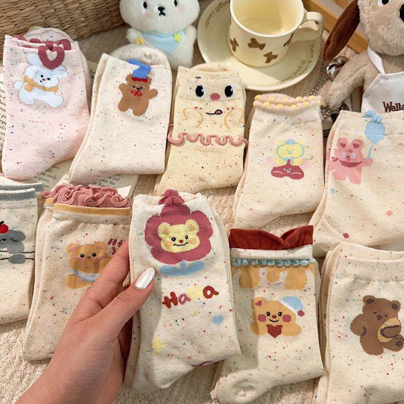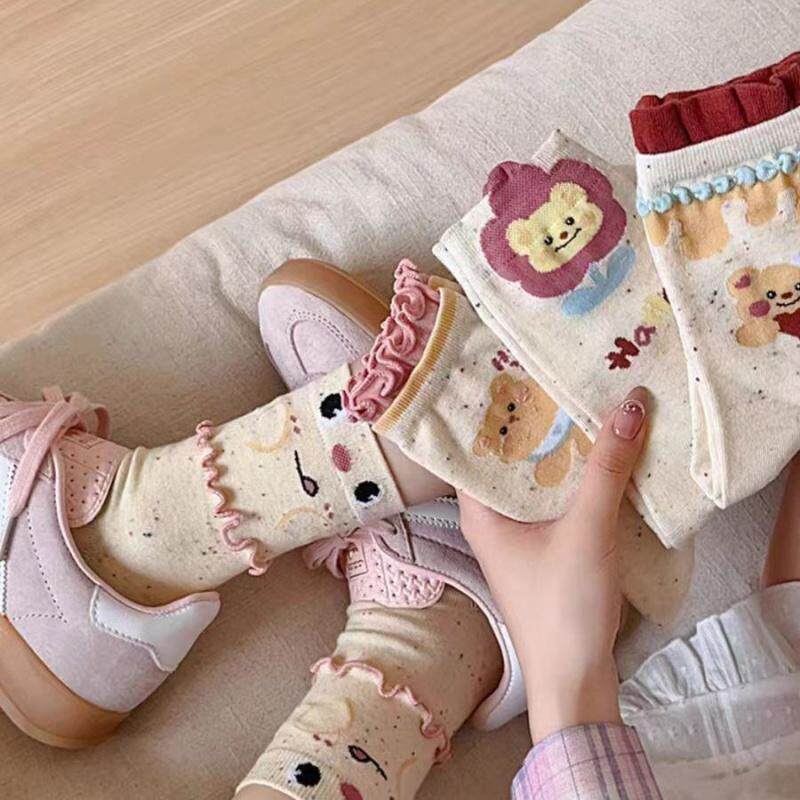 📚 日系甜美双层花边堆堆袜个性点子纱学院风中筒袜爱心卡通小熊袜子