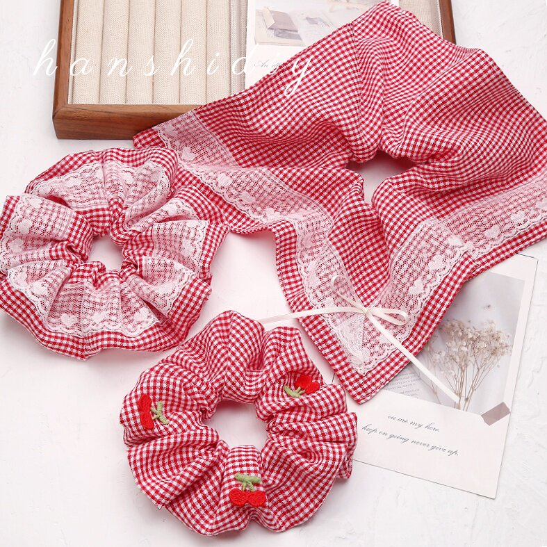 📚 复古红色小格子蕾丝大肠发圈方巾diy材料布料手工发饰头饰辅料
