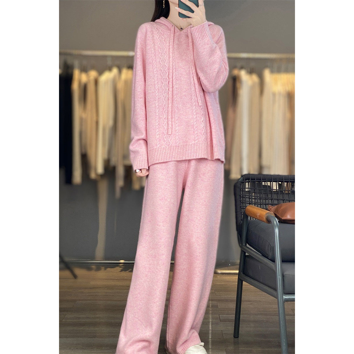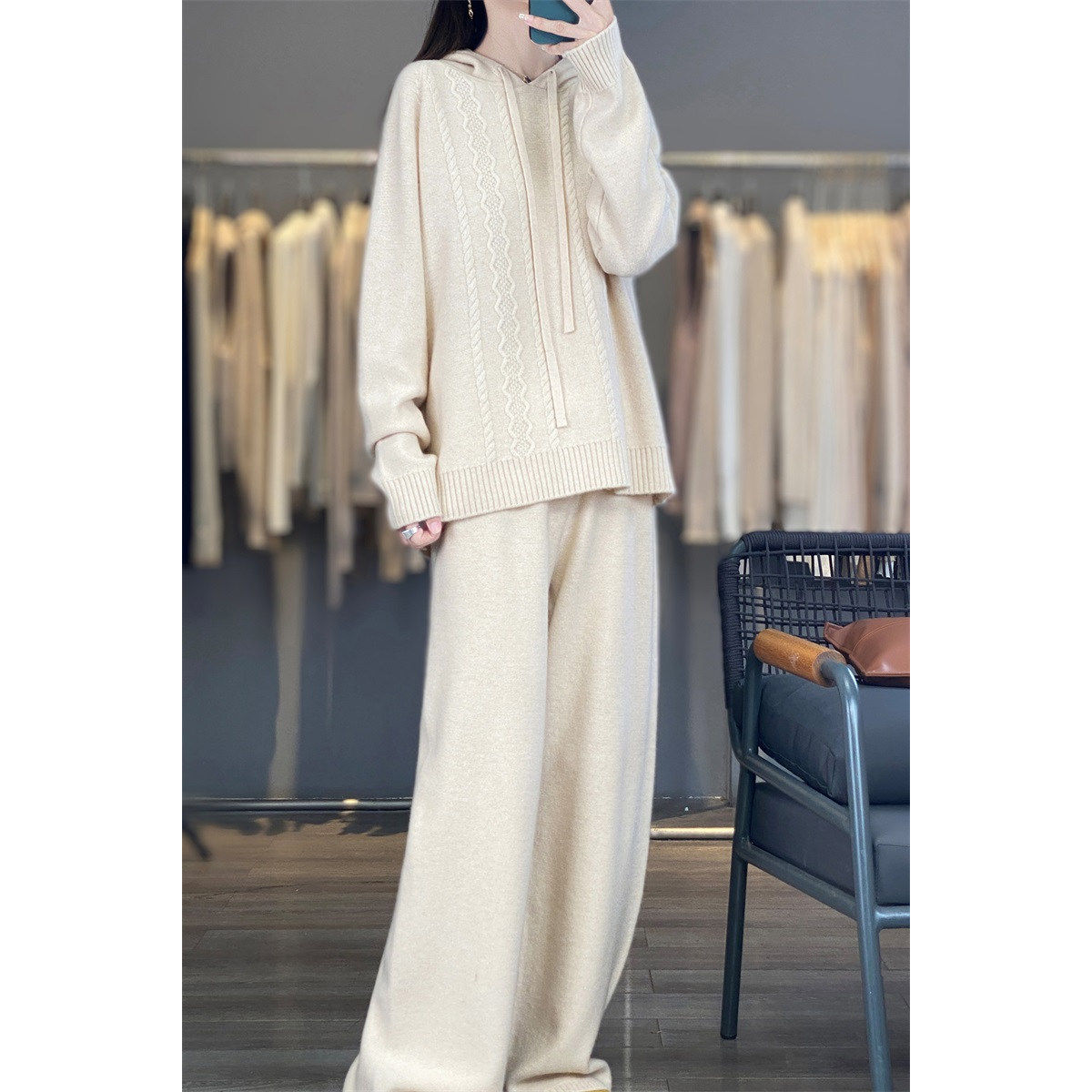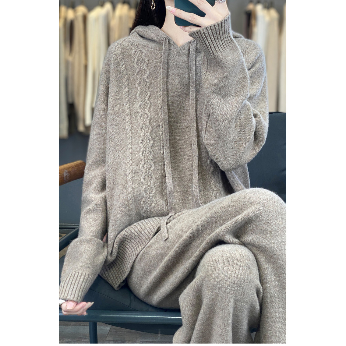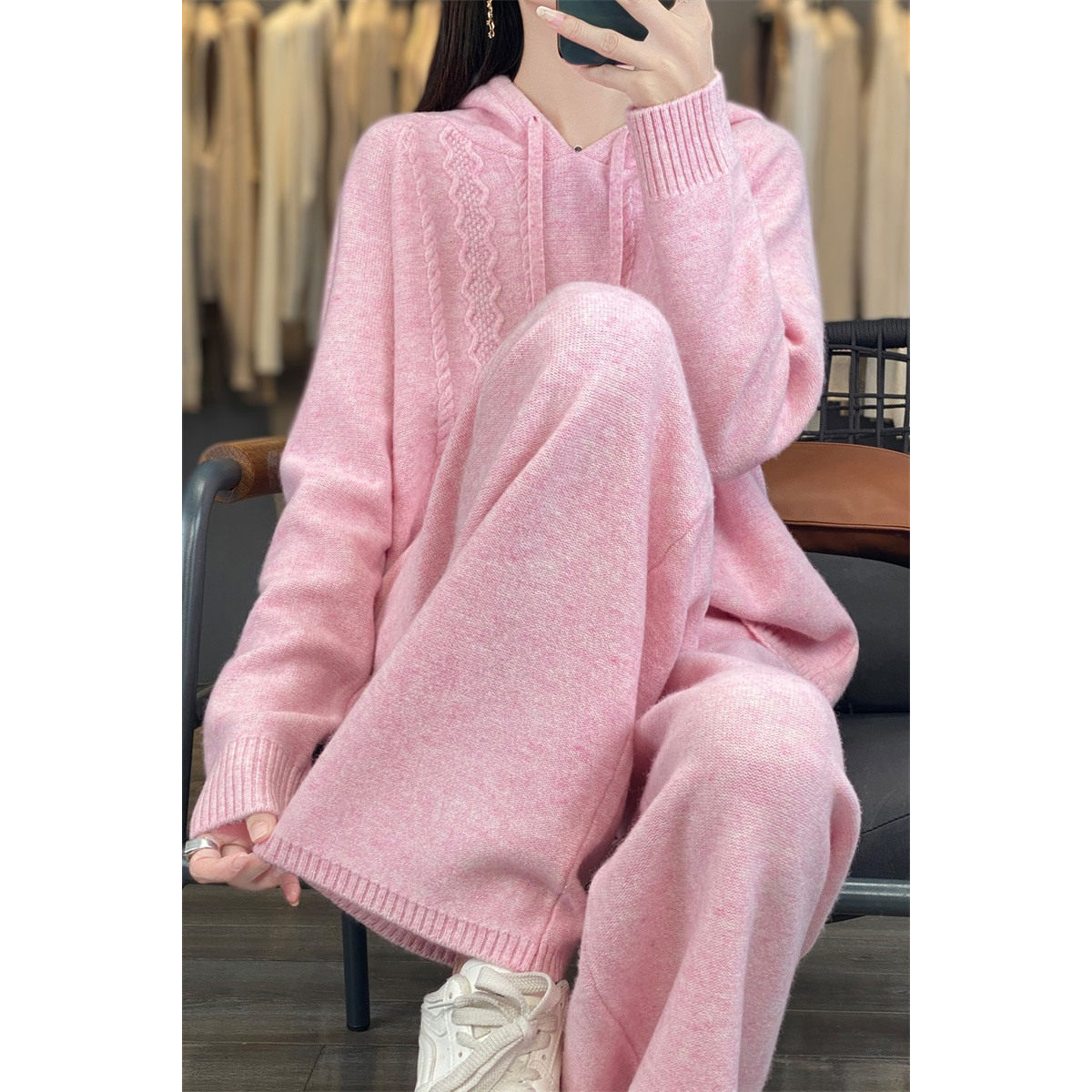 📚 秋冬羊毛套装女连帽针织羊毛衫阔腿裤时尚两件套扭花宽松休闲减龄