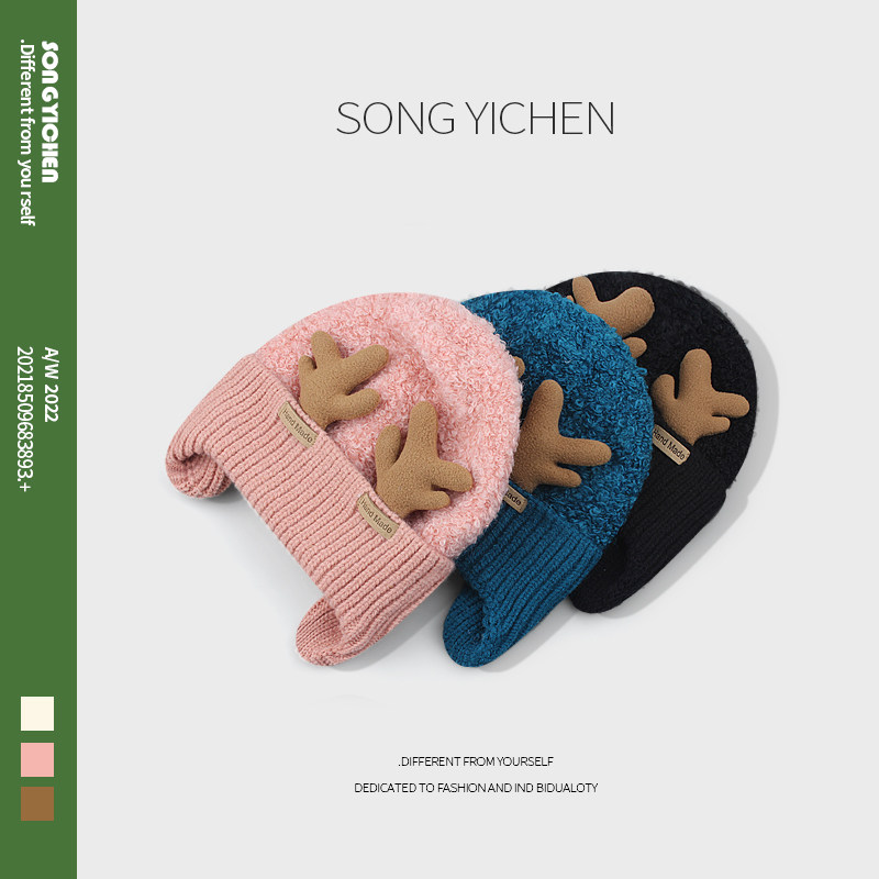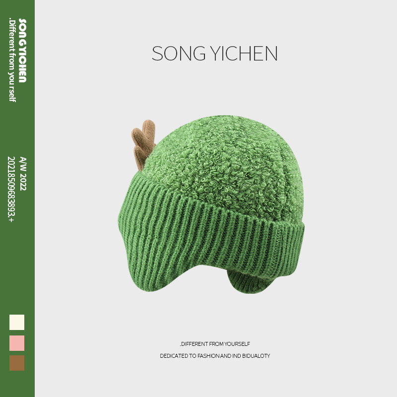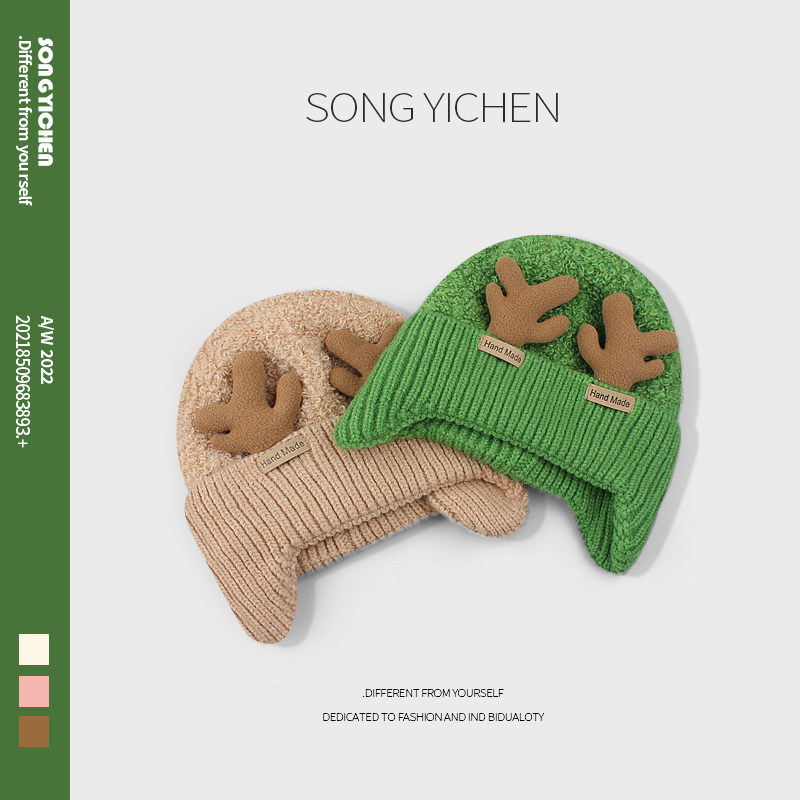 📚 韩国新款可爱鹿角毛线帽子女秋冬加绒加厚绿色针织帽保暖护耳冷帽