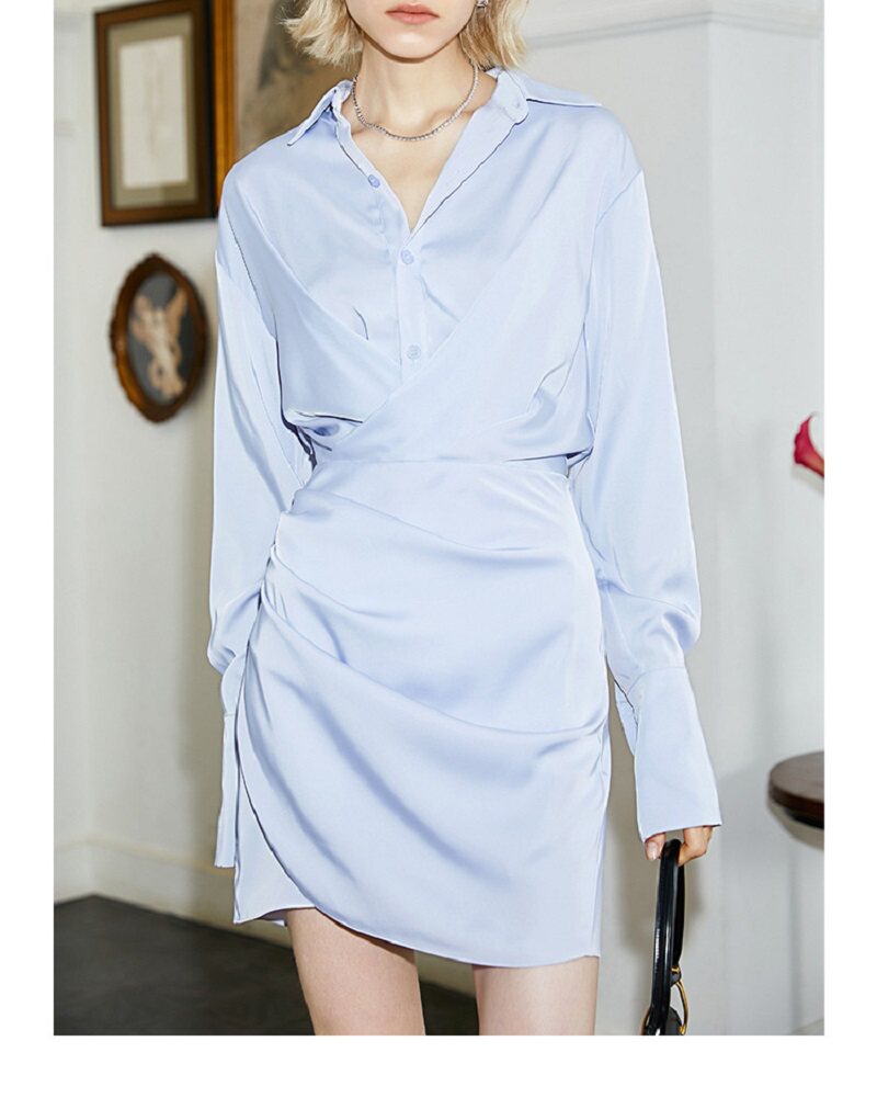 📚 法式礼服轻奢小众高端级名媛气质收腰包臀显瘦衬衫缎面褶皱连衣裙