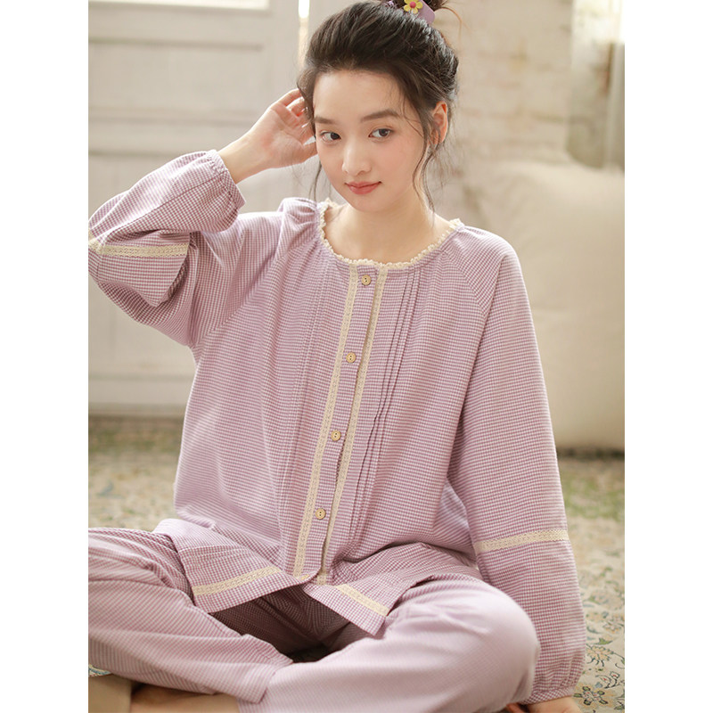 📚 秋冬甜美花边纯棉睡衣女布料100全棉磨毛厚圆领长袖可外穿家居服
