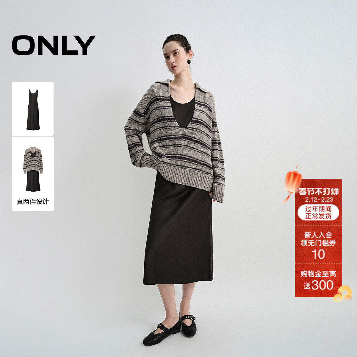 📚 ONLY2026春季新款深V翻领针织衫垂坠丝滑A字中长裙套装连衣裙女