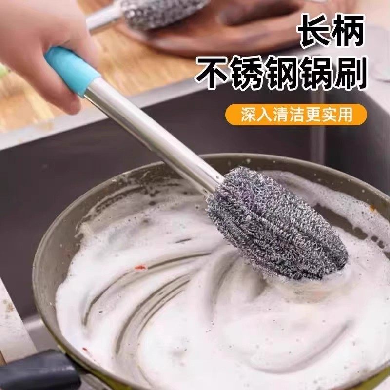 📚 加长柄不锈钢锅刷钢丝球刷子长杆厨房洗锅洗碗家用洗碗钢丝球带柄