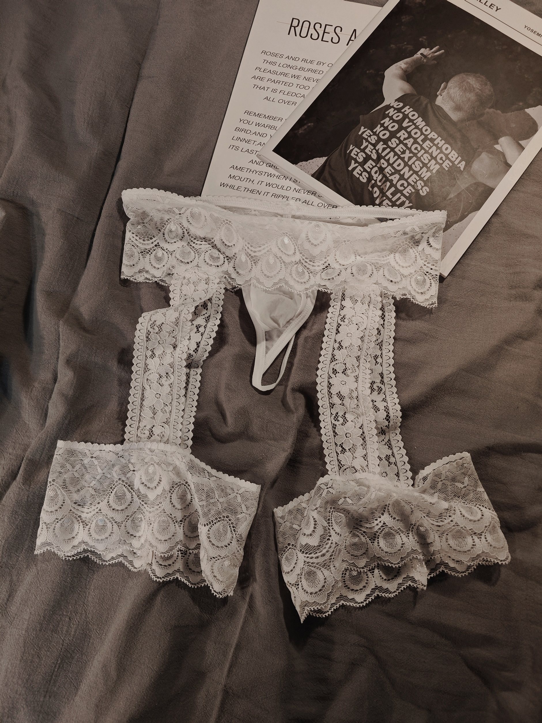 📚 男士性感蕾丝吊带丁字裤青年枪弹分离内裤蕾大腿环诱惑伪娘T裤