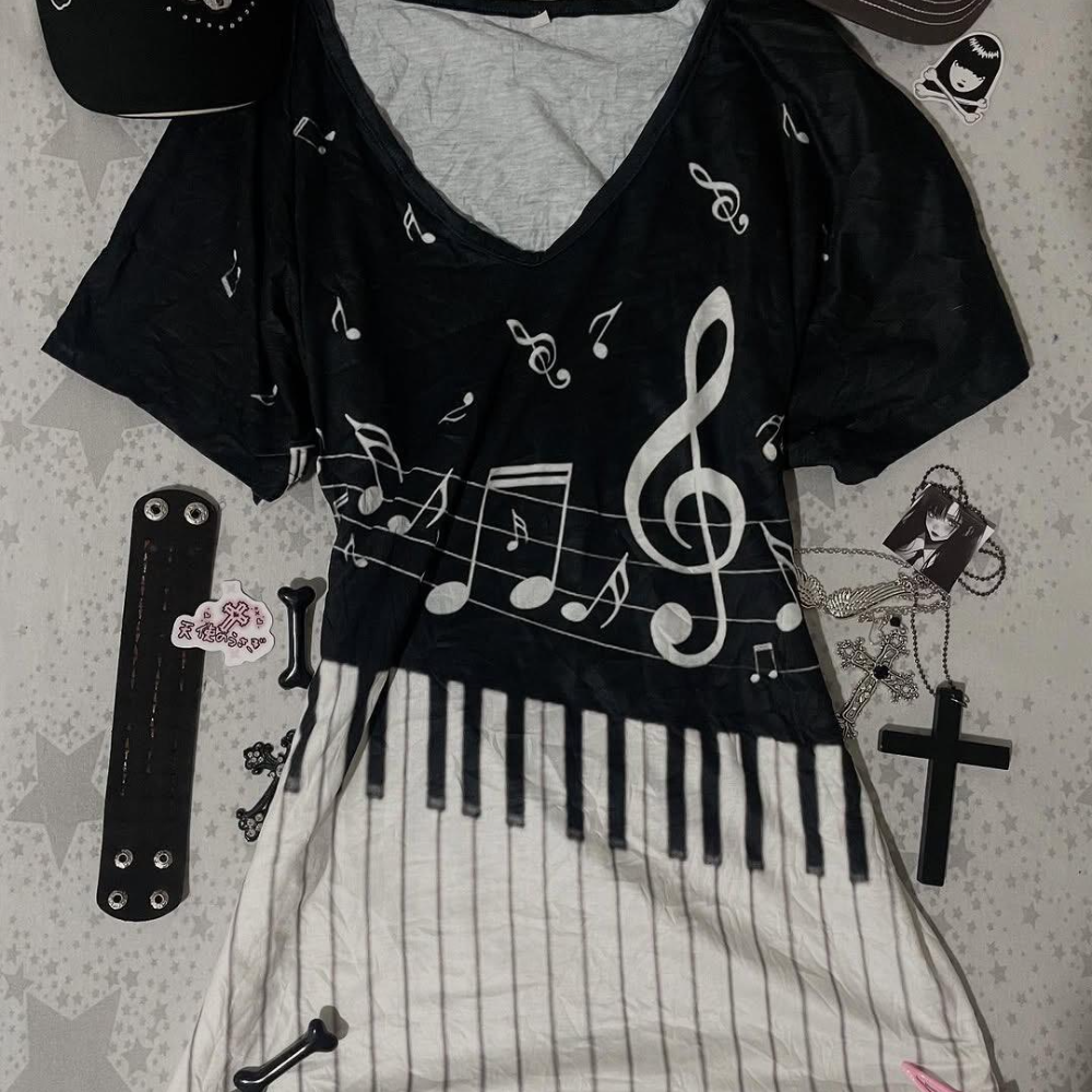📚 美式复古Vintage古着亚文化黑白底音符钢琴键印花短袖T恤V领上衣