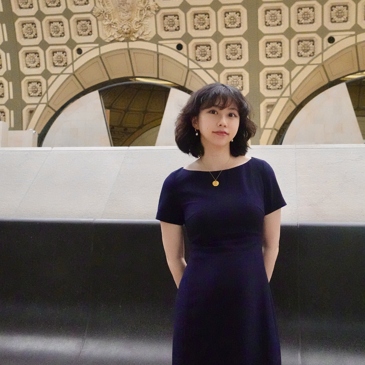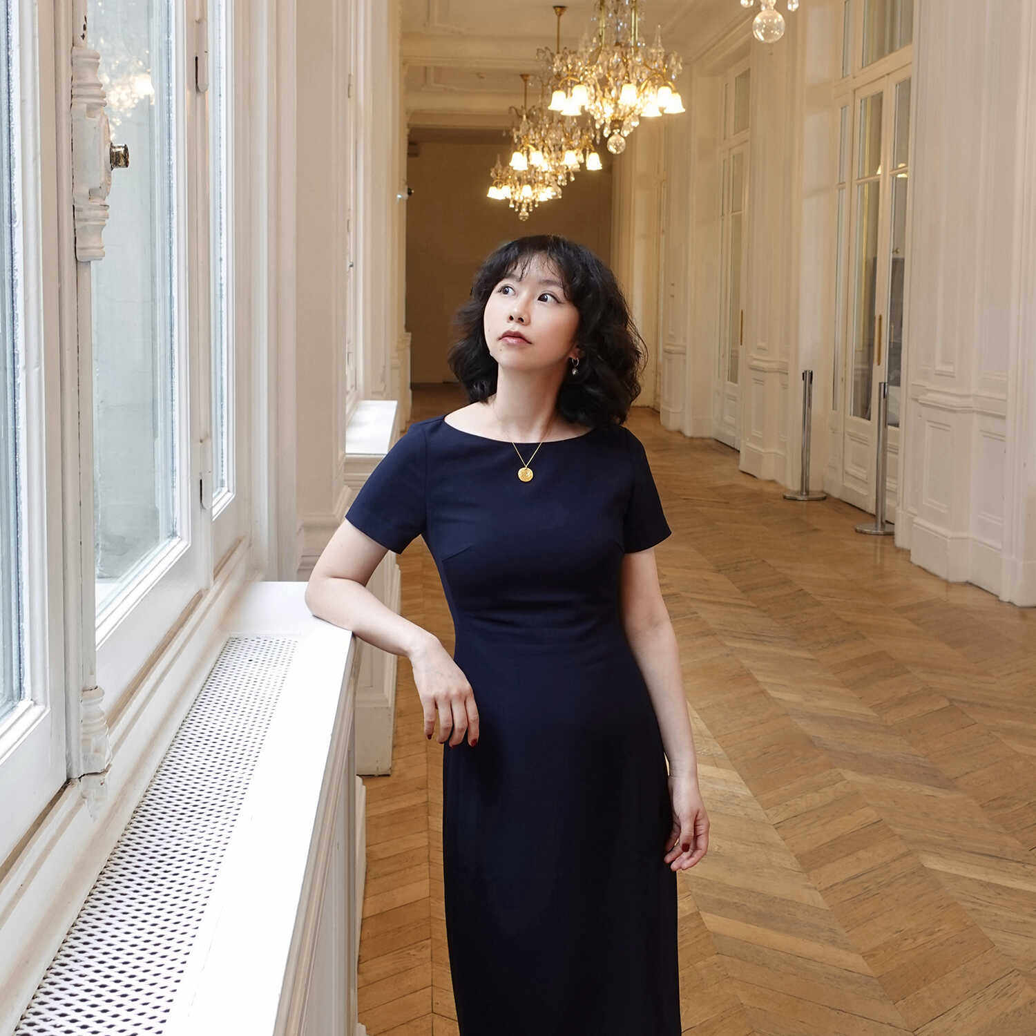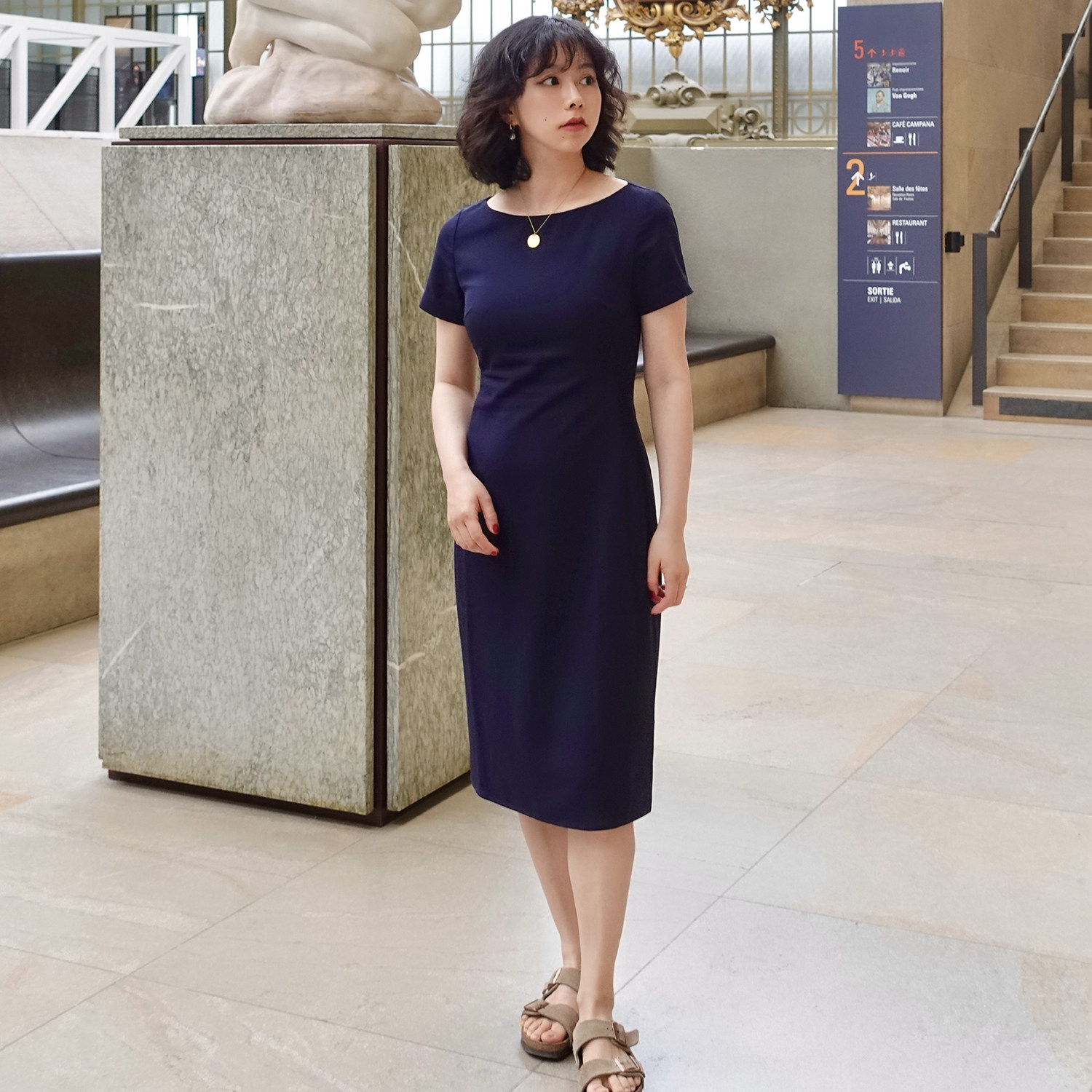 📚 Into Fiction博物馆管理员藏青色一字领短袖显瘦醋酸高智感连衣裙