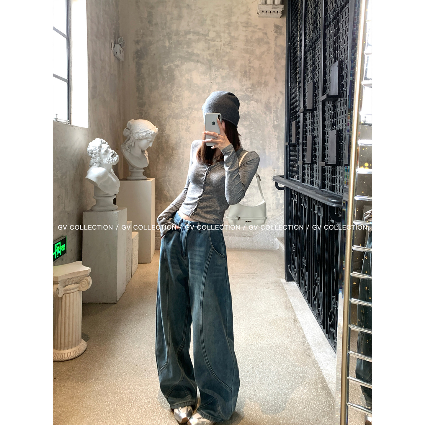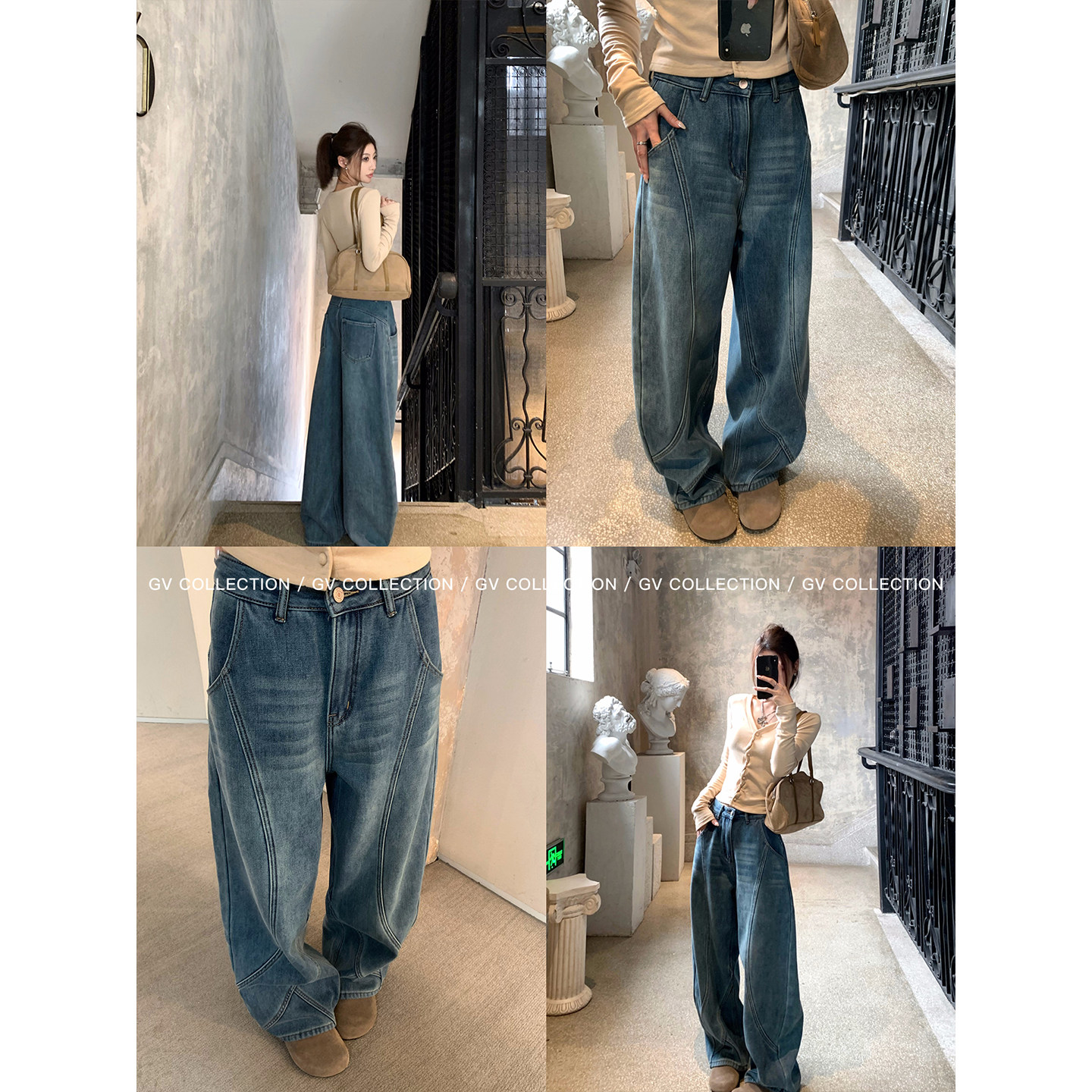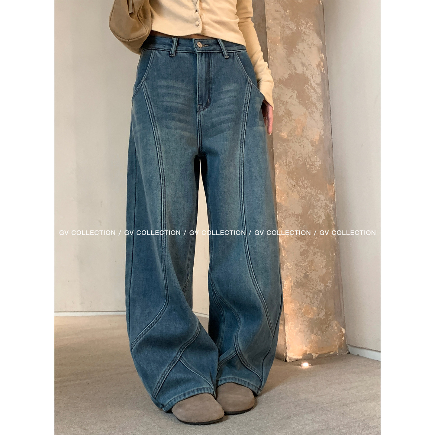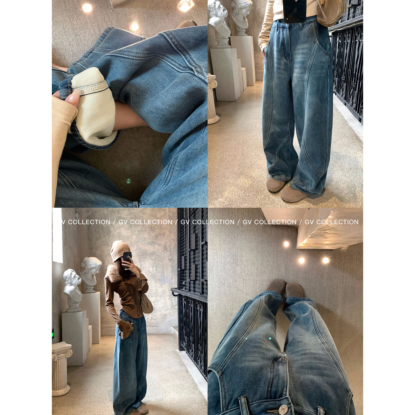📚 GV大白哥 解构冬日 加绒加厚复古美式水洗浅蓝立体线条弯刀牛仔裤