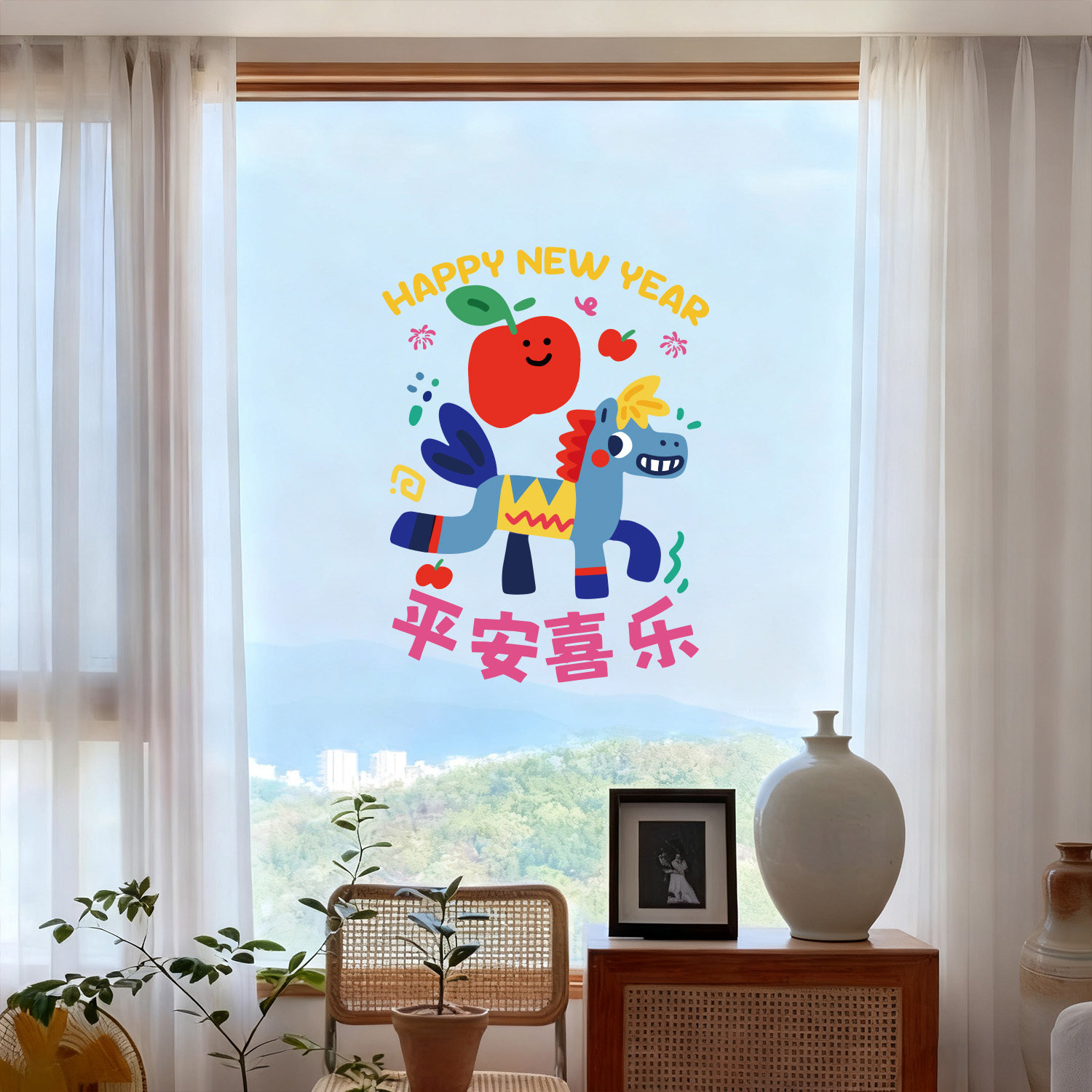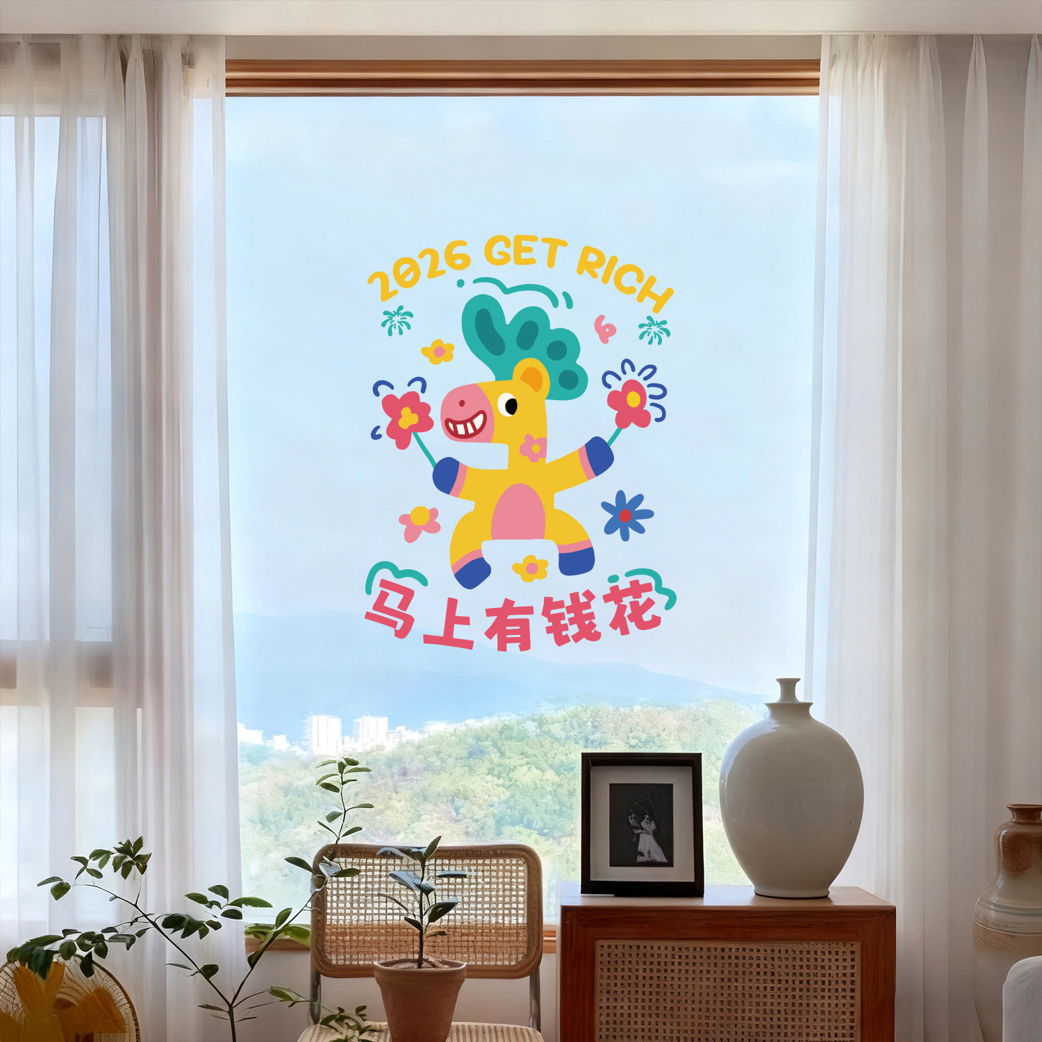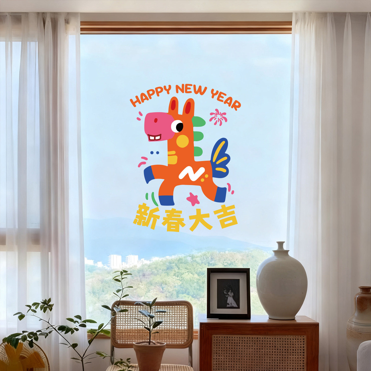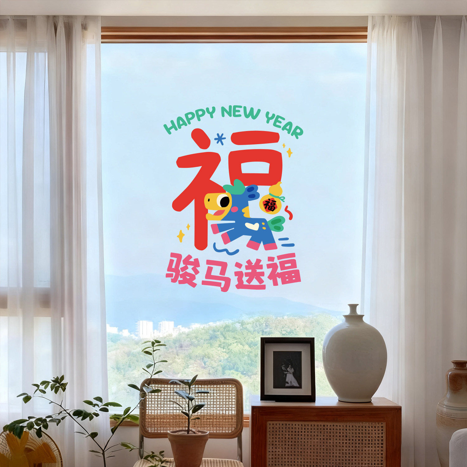 📚 原创马年新年装饰玻璃静电贴纸客厅店铺橱窗玻璃可爱布置窗花节日