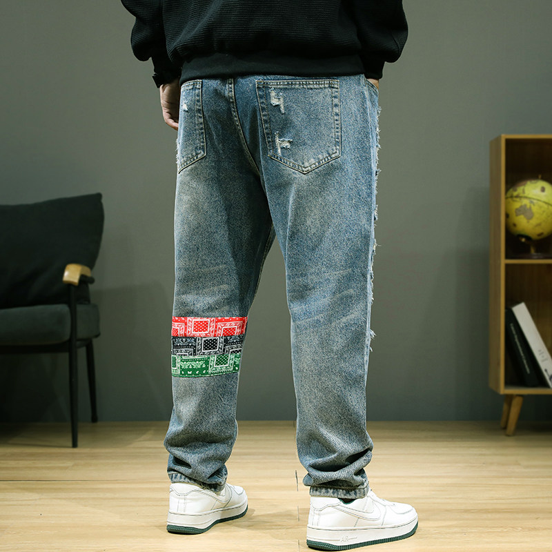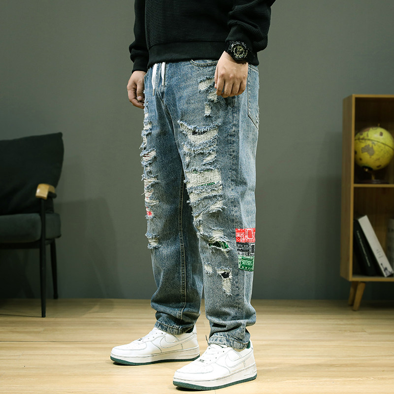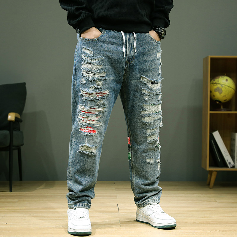 📚 胖子潮牌破洞牛仔裤男秋冬加肥加大码宽松破烂乞丐裤子陈冠希同款