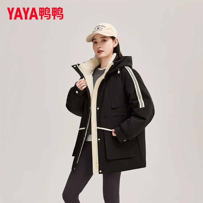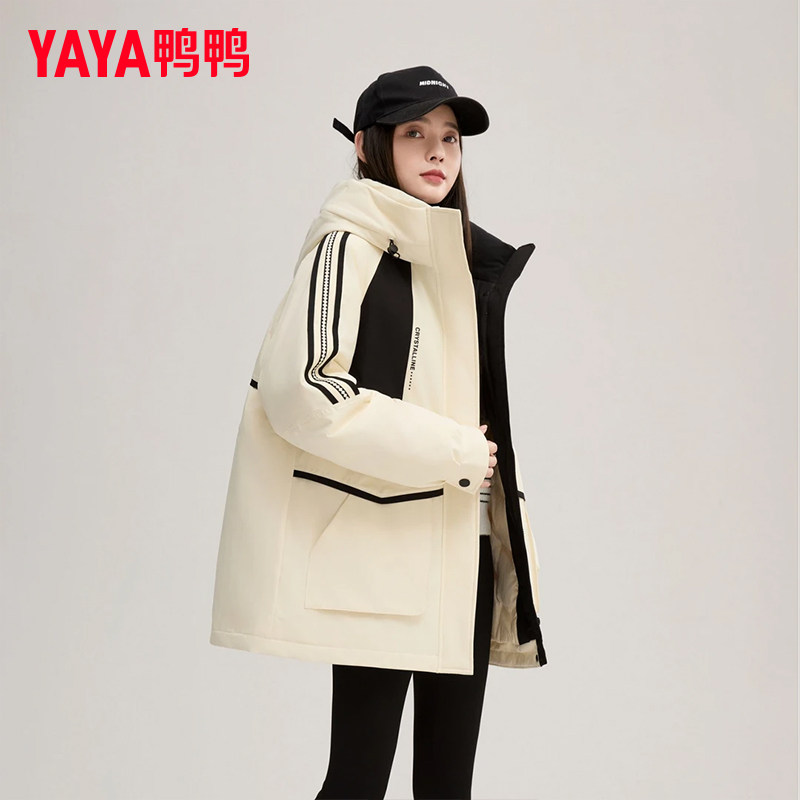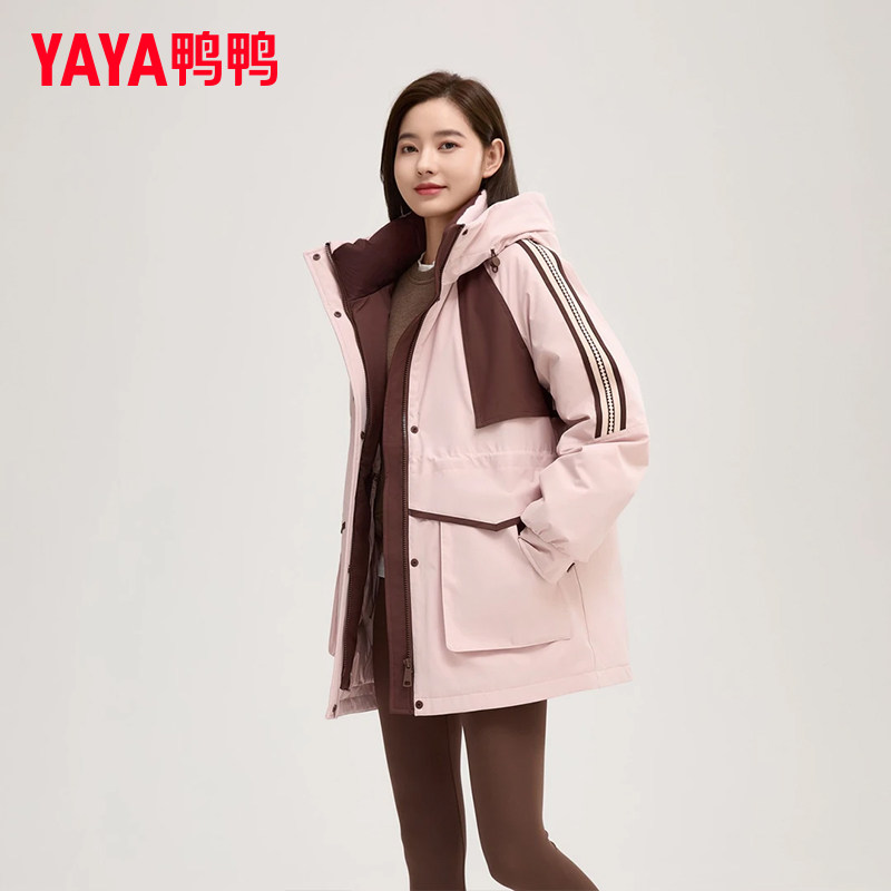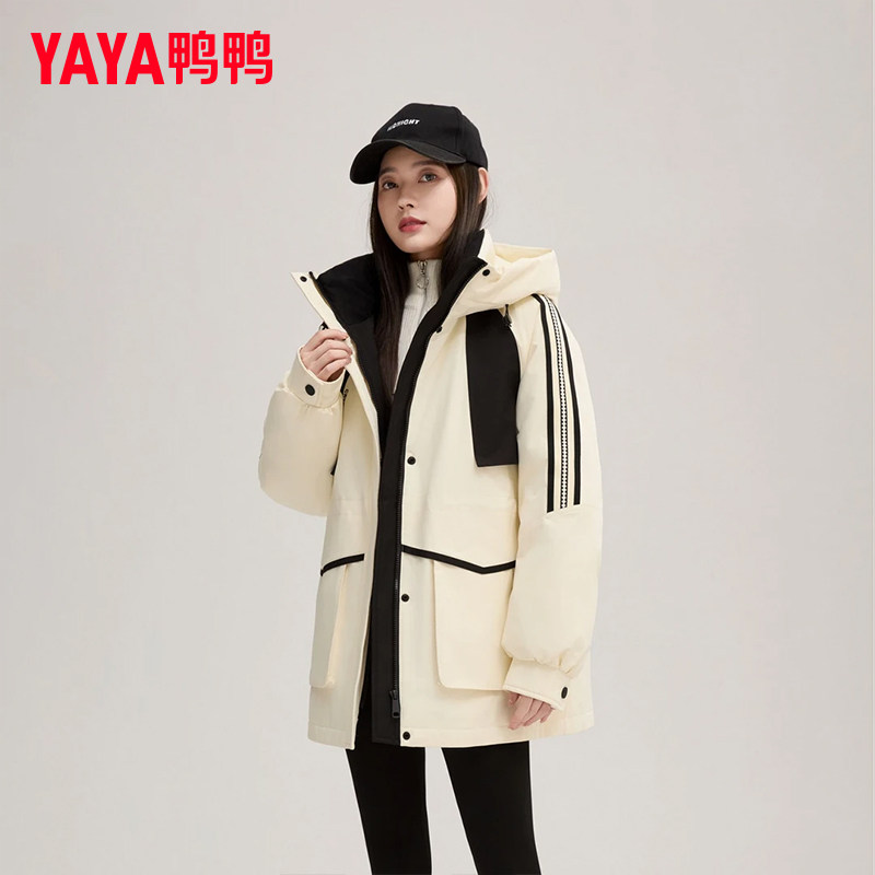 📚 鸭鸭撞色拼接中长款羽绒服女冬季加厚户外休闲防风保暖派克外套