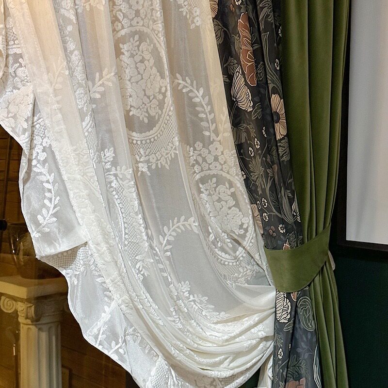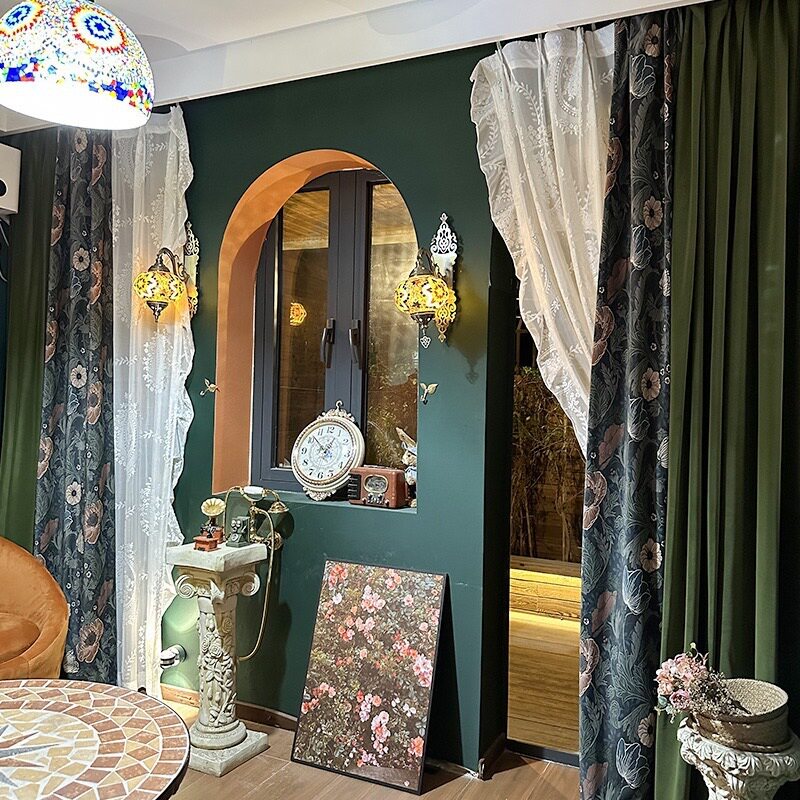 📚 橄榄绿色丝绒窗帘遮光小众设计款美式客厅复古浪漫卧室法式蕾丝纱