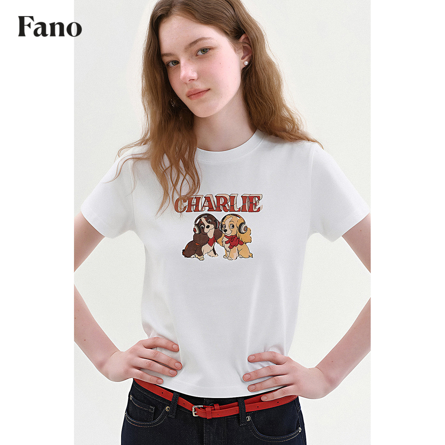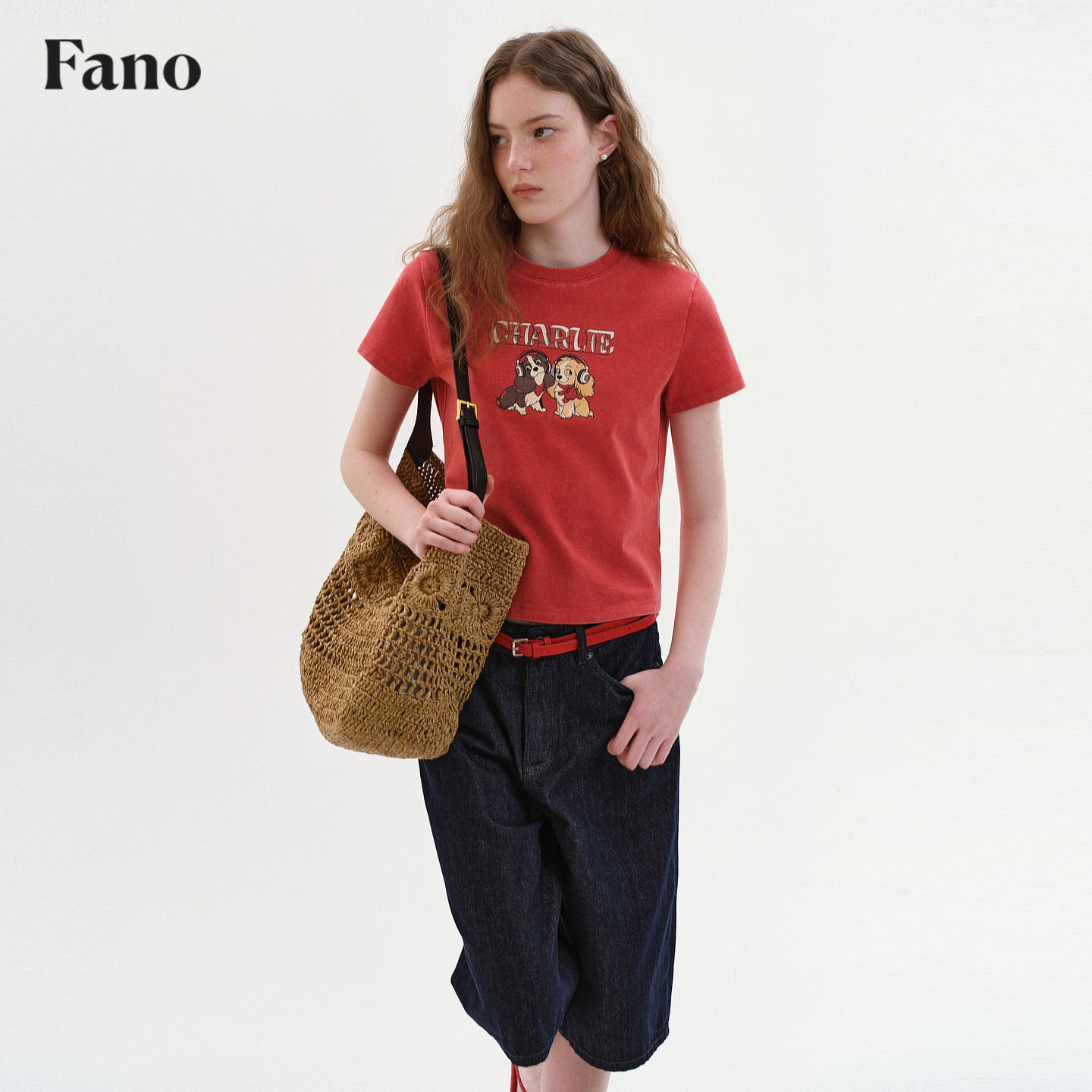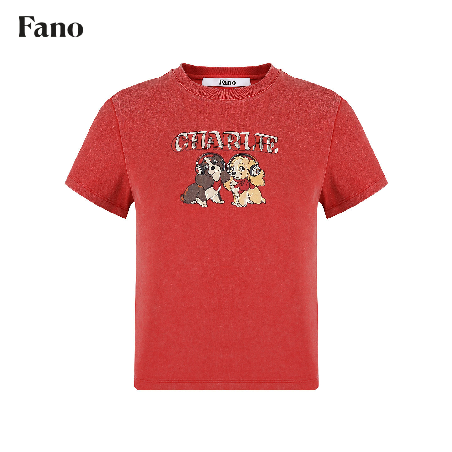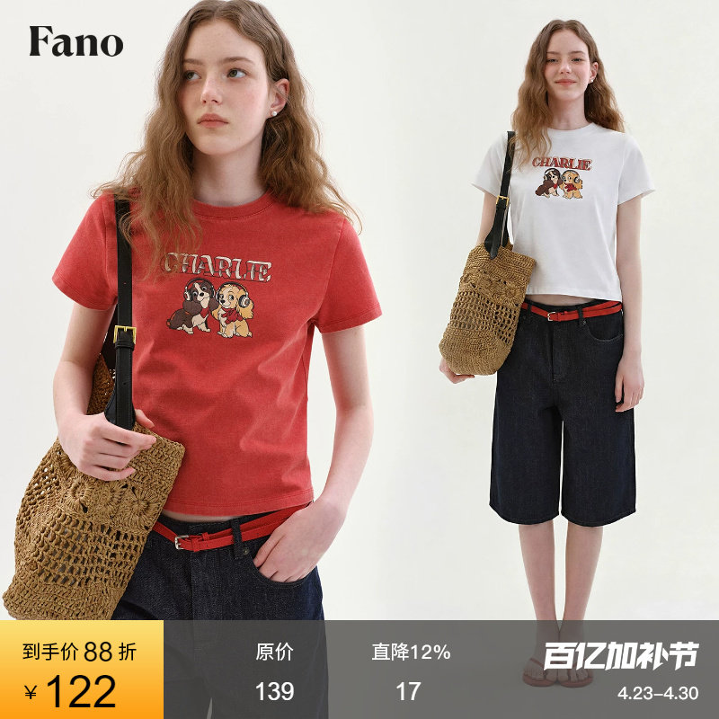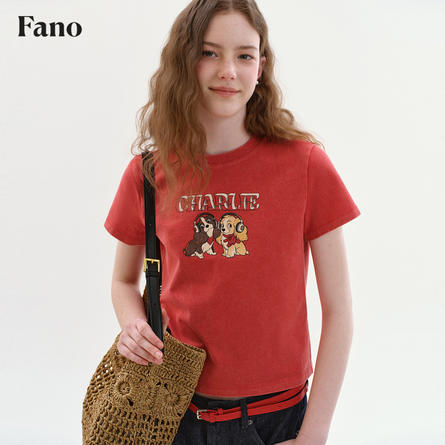 📚 范洛Fano 100棉美式复古童趣风T恤女2026夏新款小狗印花红色上衣