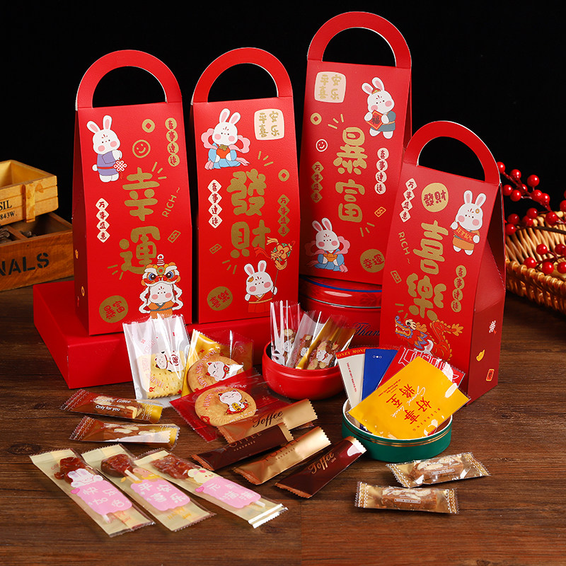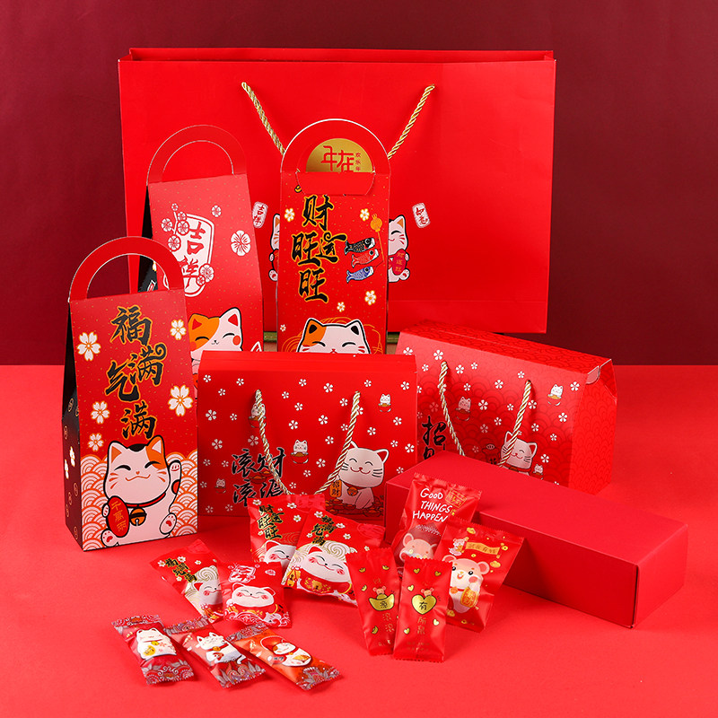 📚 喜庆红招财猫福气满满手提袋新年包装袋雪花酥包装袋牛轧糖糖果袋