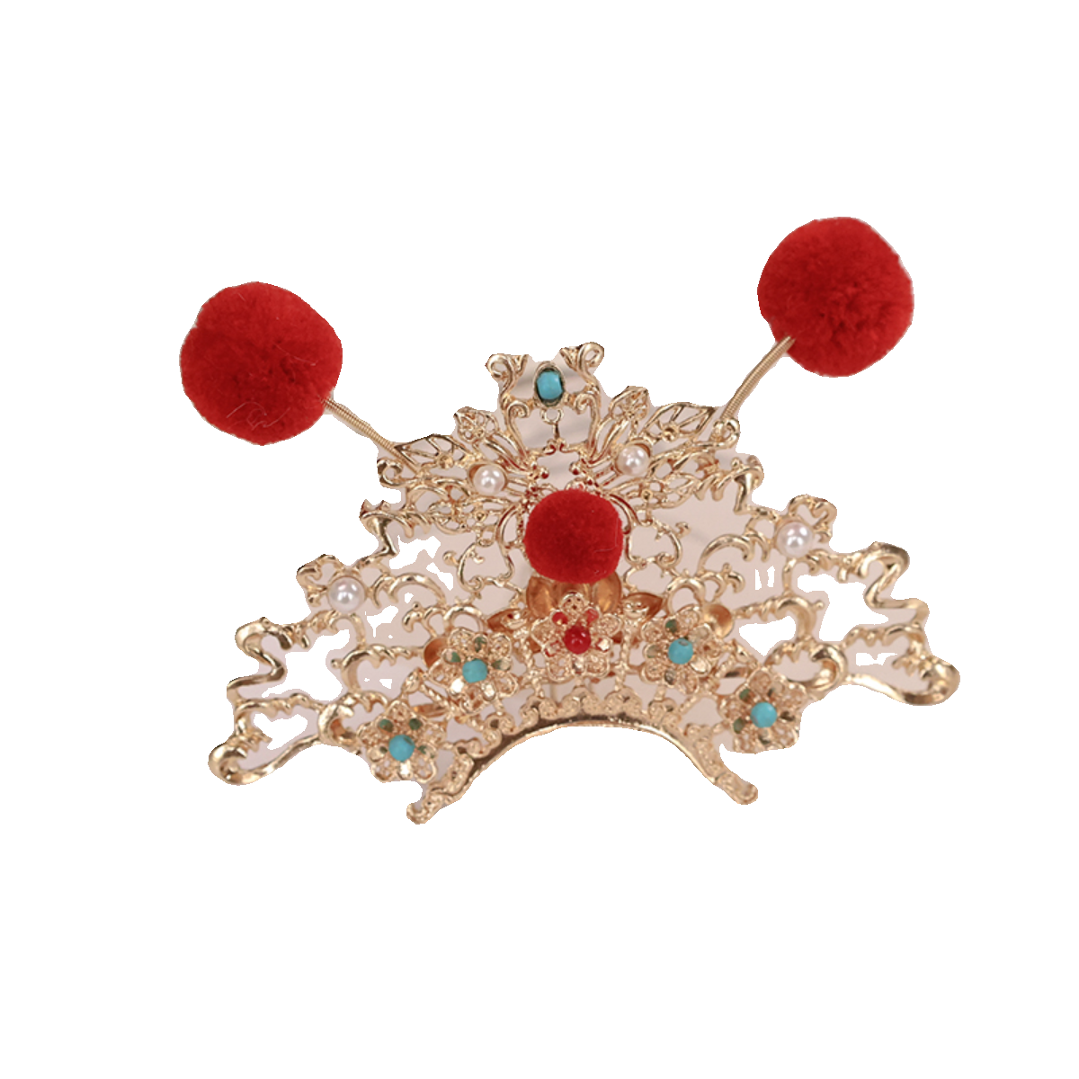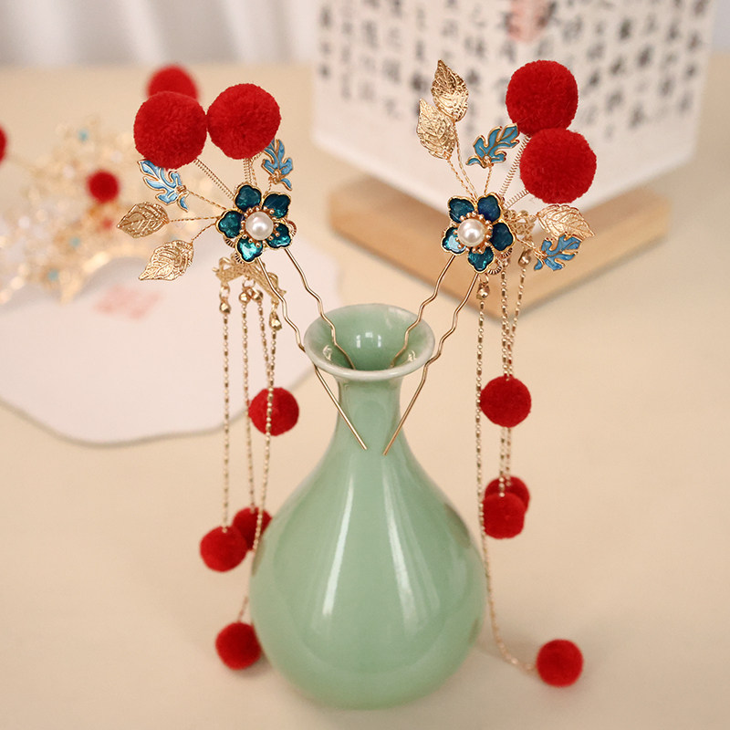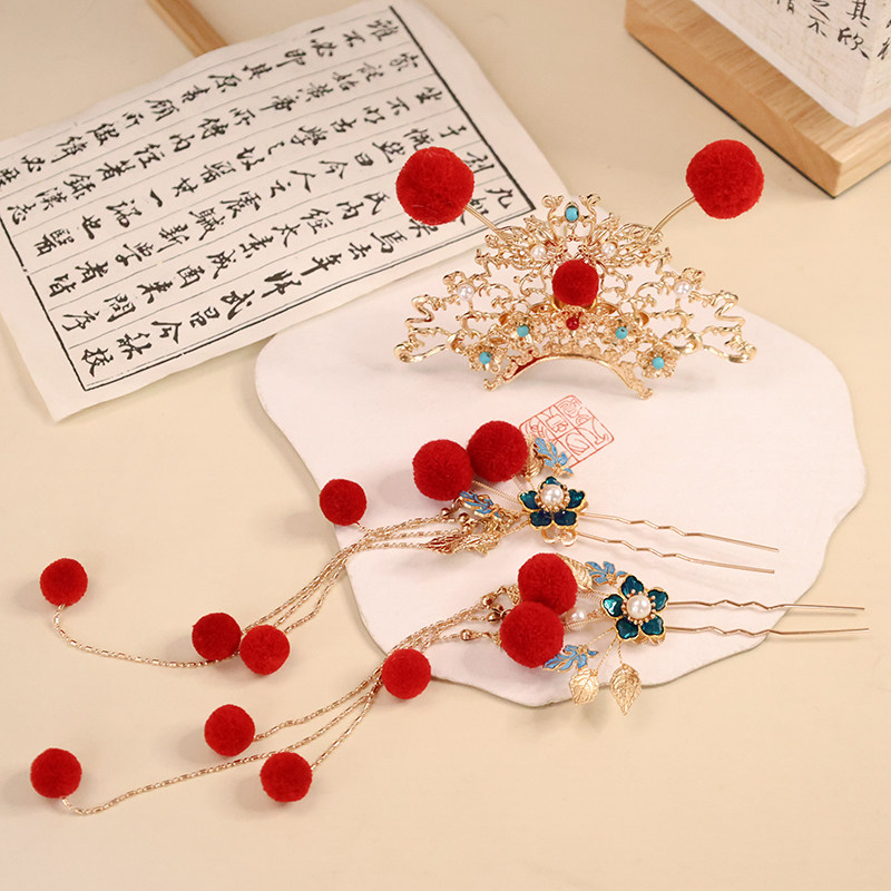 📚 小财神发饰新年红色毛球流苏发钗发冠3件套戏曲风汉服古风头饰