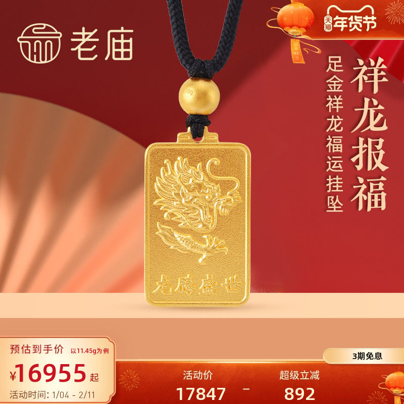 📚 老庙黄金足金999古法生肖龙报福运黑绳带金珠金牌挂坠龙腾盛世