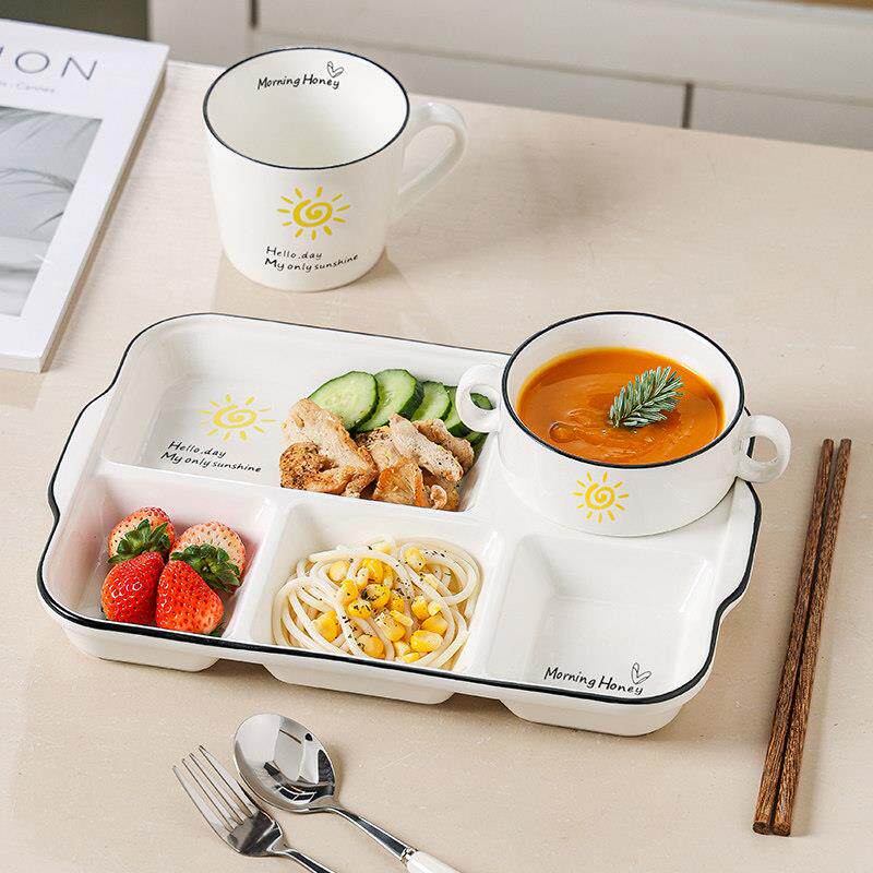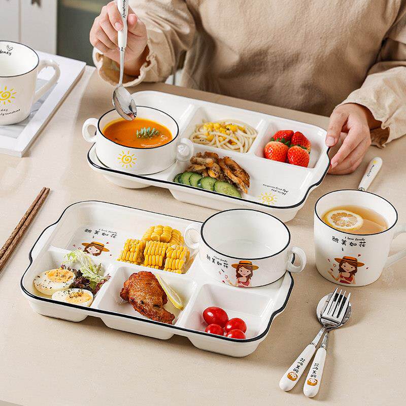 📚 陶瓷分餐分隔格餐盘早餐减脂五格月子餐具大人加深高级感家用套装