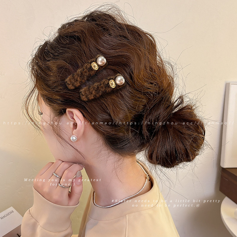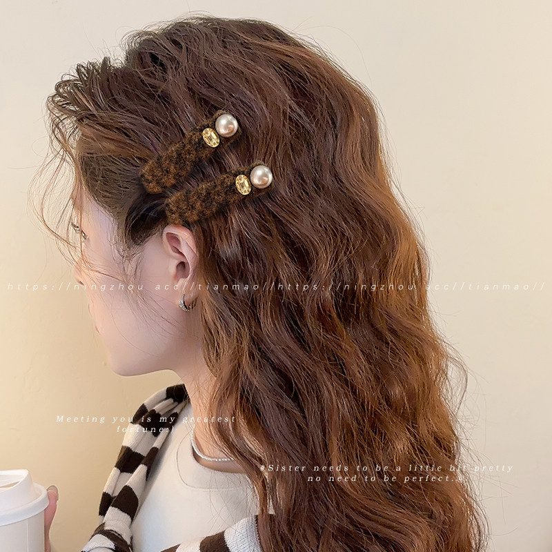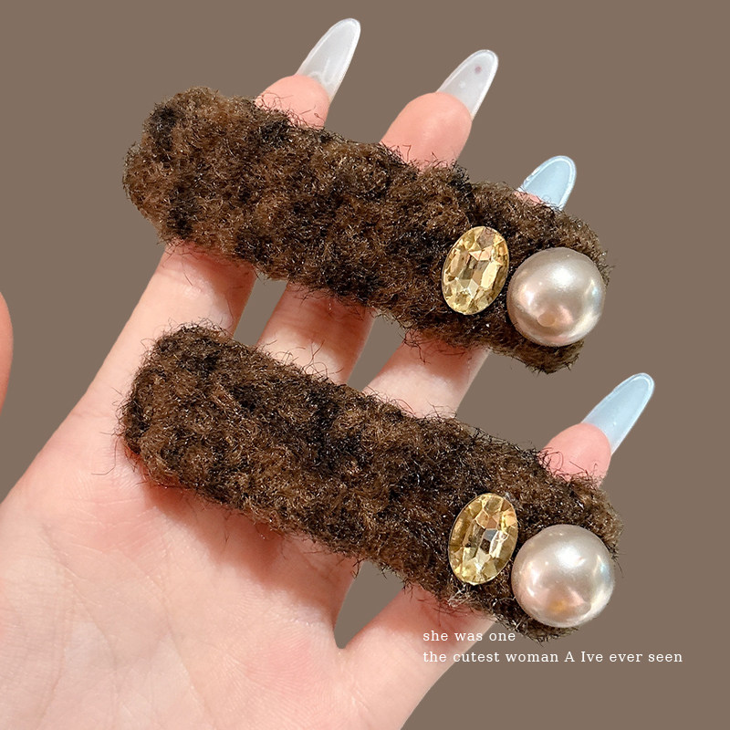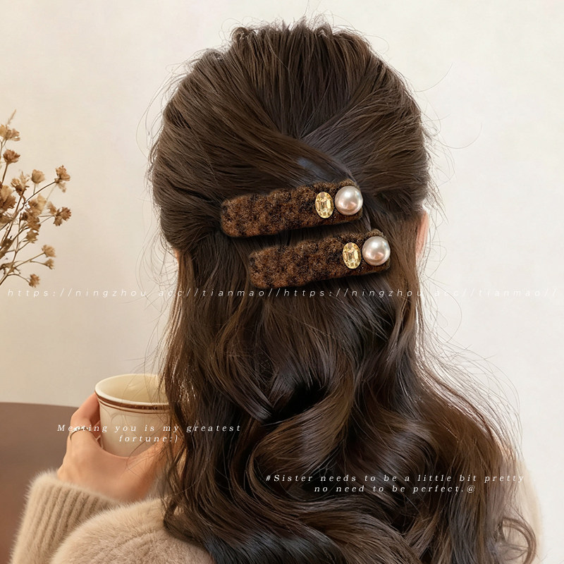 📚 咖色毛绒珍珠发夹高级感刘海侧边夹前额一字夹碎发发卡女秋冬发饰