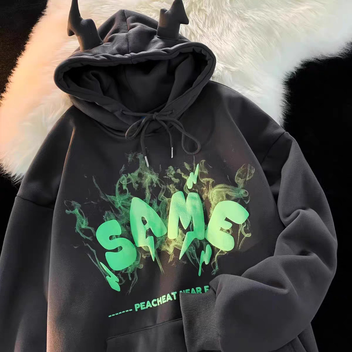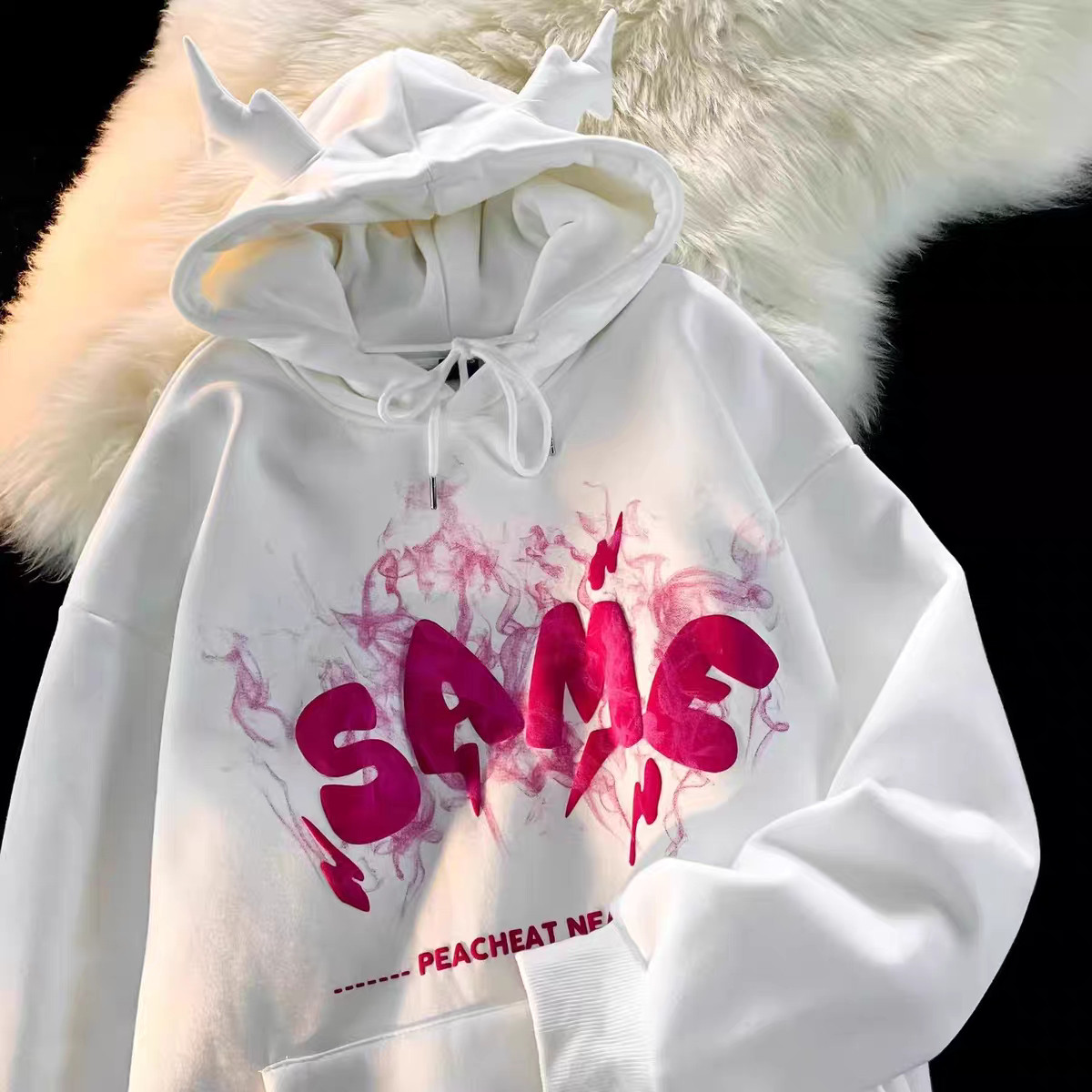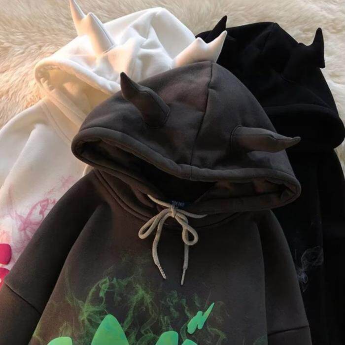 📚 春秋季恶魔潮流印花男女生情侣连帽卫衣甜酷加绒套头带角洋气卫衣