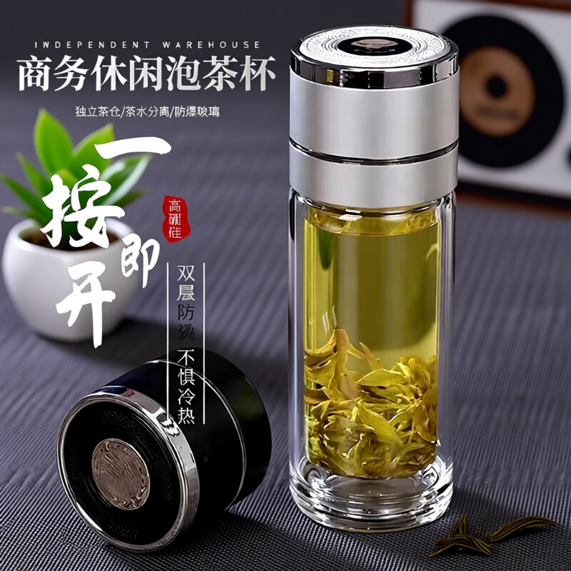 📚 一键开盖车载双层玻璃杯男士办公室保温水杯茶杯速开启茶水分离杯